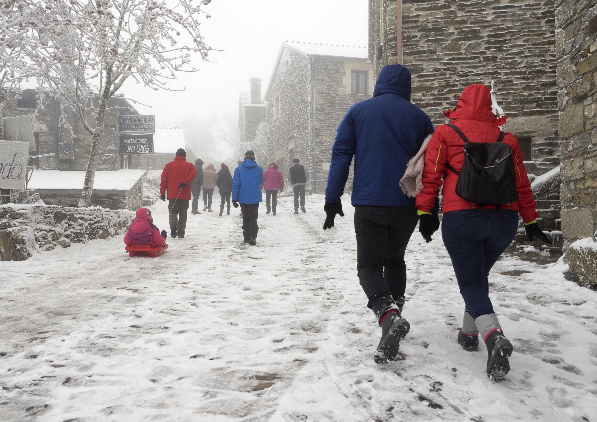Visitantes caminan por las calles heladas de O Cebreiro, donde el temporal que afecta desde el viernes al tercio norte peninsular y Baleares, con importantes nevadas en cotas bajas, vientos fuertes y temporal marítimo, se mantendrá durante todo el fin de semana, con temperaturas a la baja.
