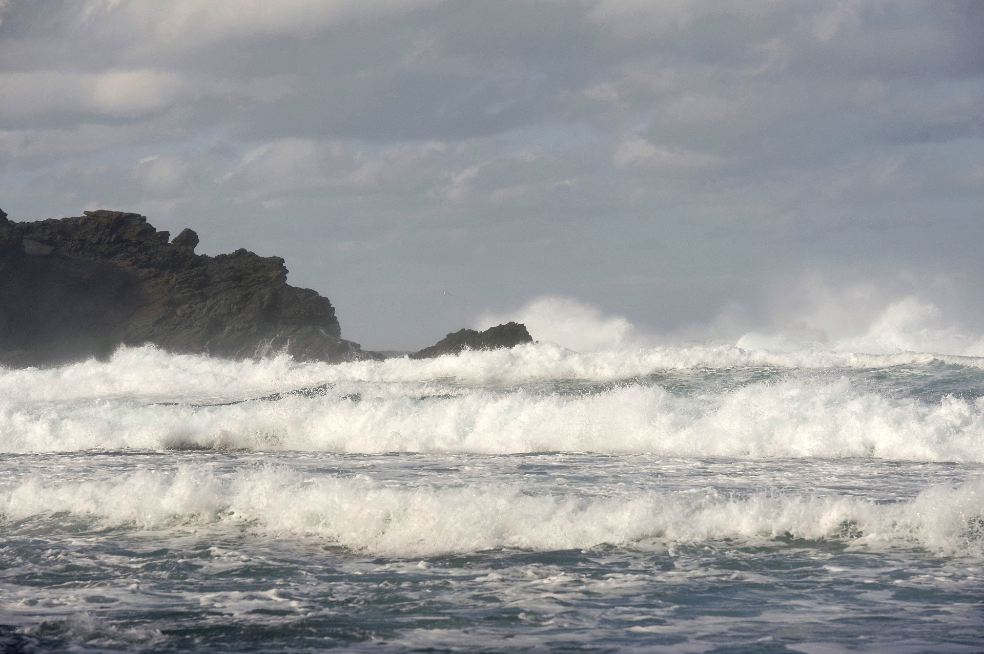 Grandes olas chocan contra las rocas en las inmediaciones del faro de Favàritx, en el municipio de Mahón, que se encuentra en alerta naranja por fenómenos costeros y viento muy fuerte.