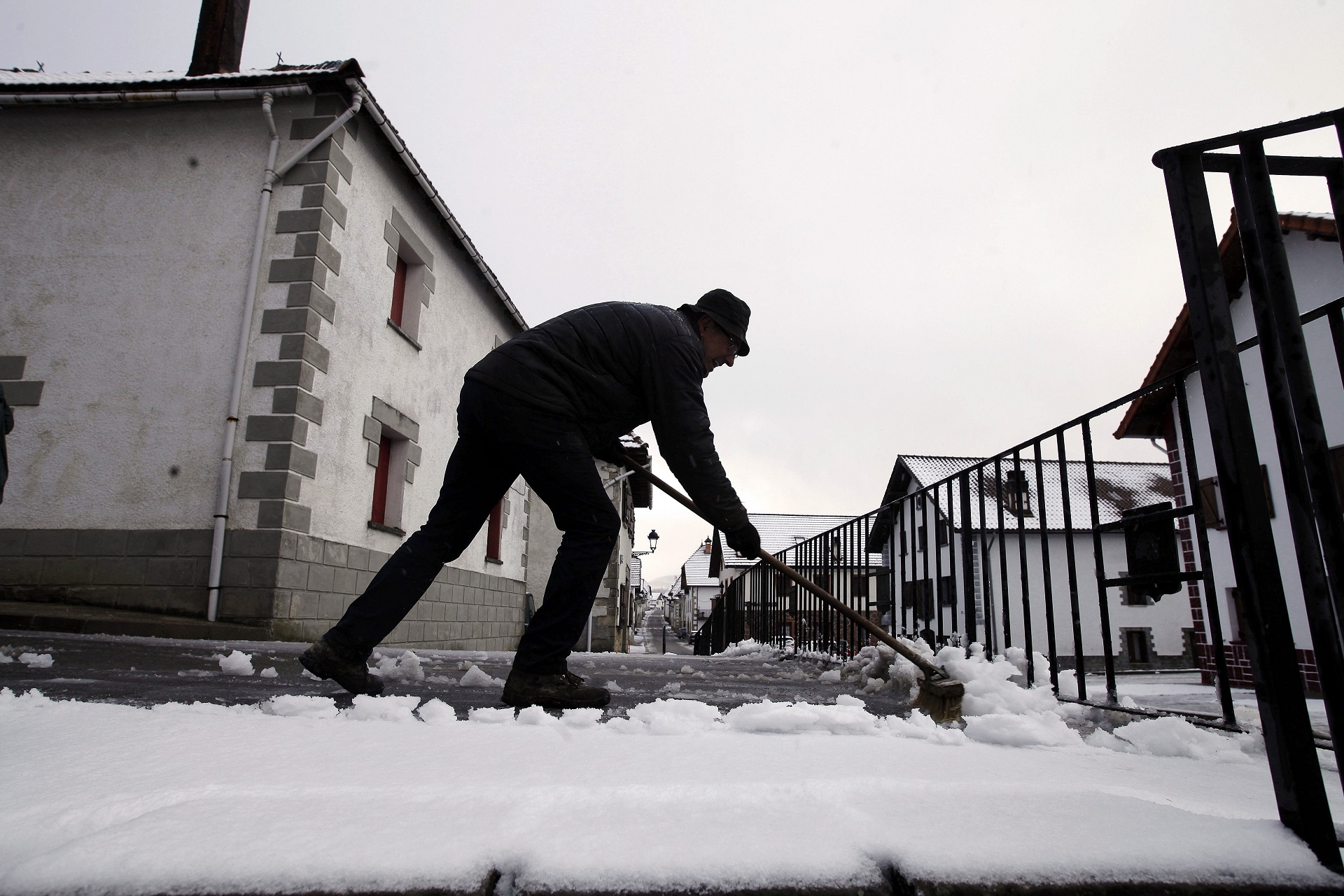 Los habitantes de Espinal se esmeran en limpiar sus calles durante el temporal de nieve que azota al Norte de Navarra y que continuará, por lo menos hasta la semana que viene.