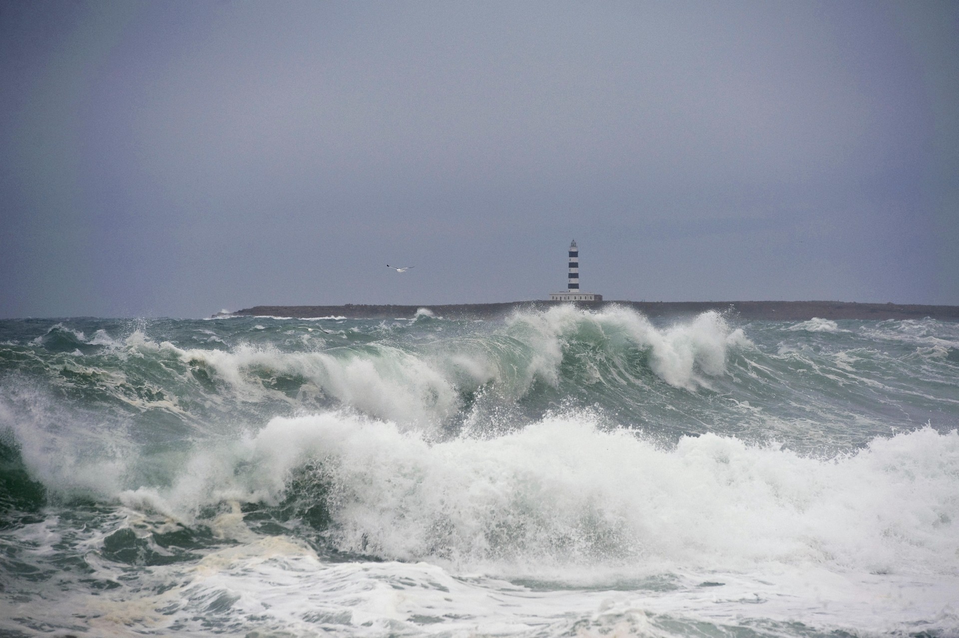 La isla de Aire vista desde el municipio de Sant LLuís, en Menorca, donde se registra un fuerte oleaje. Baleares está en alerta naranja por lluvias, fenómenos costeros y por viento que puede llegar a 120 kilómetros por hora.