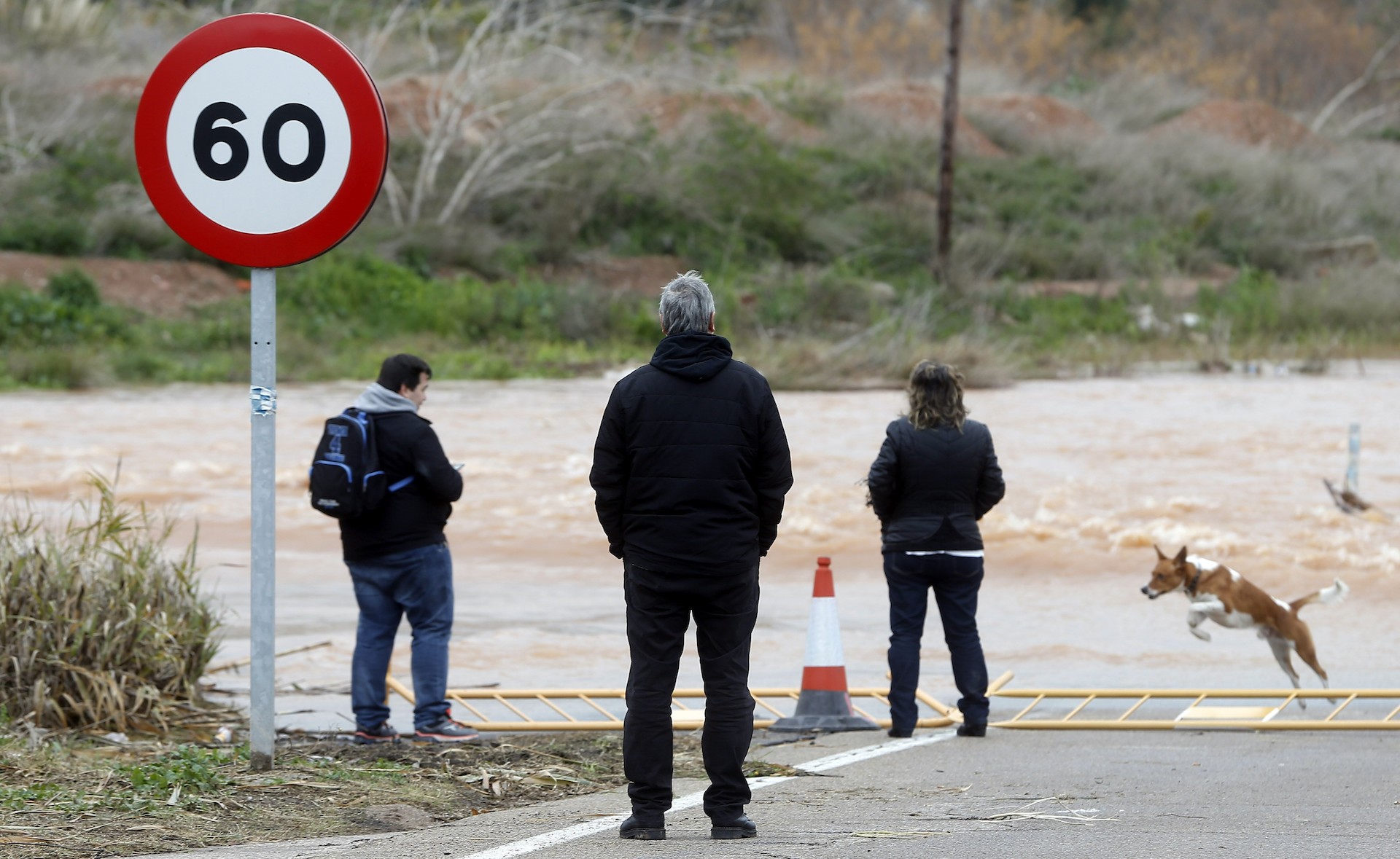 Varias personas contemplan la corriente de agua que ha provocado la crecida del barranco del Carraixet a consecuencia del temporal, cortando varias carreteras a su paso