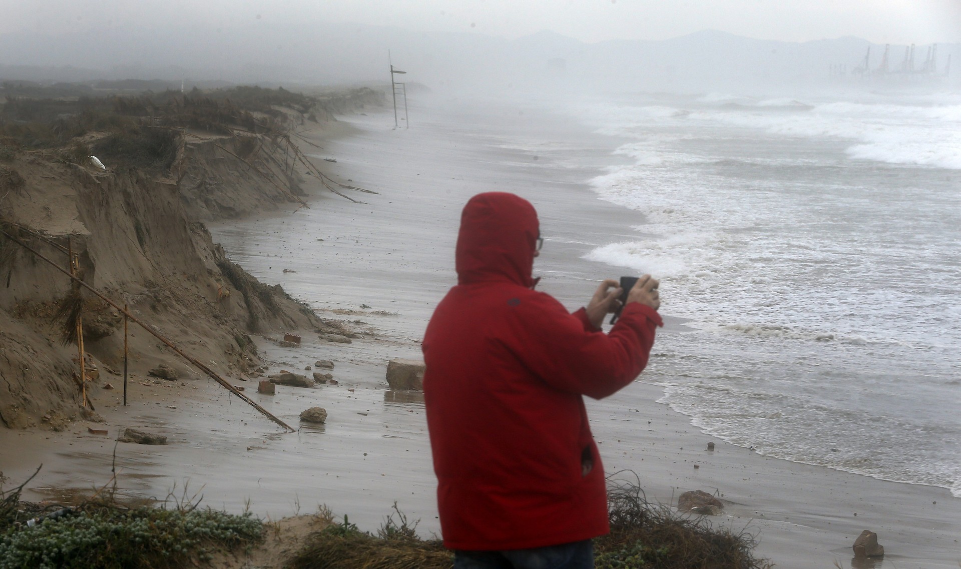 Un hombre toma imágenes de la playa de El Saler, comida por el temporal que ha obligado a la Autoridad Portuaria a cerrar el puerto de Valencia.