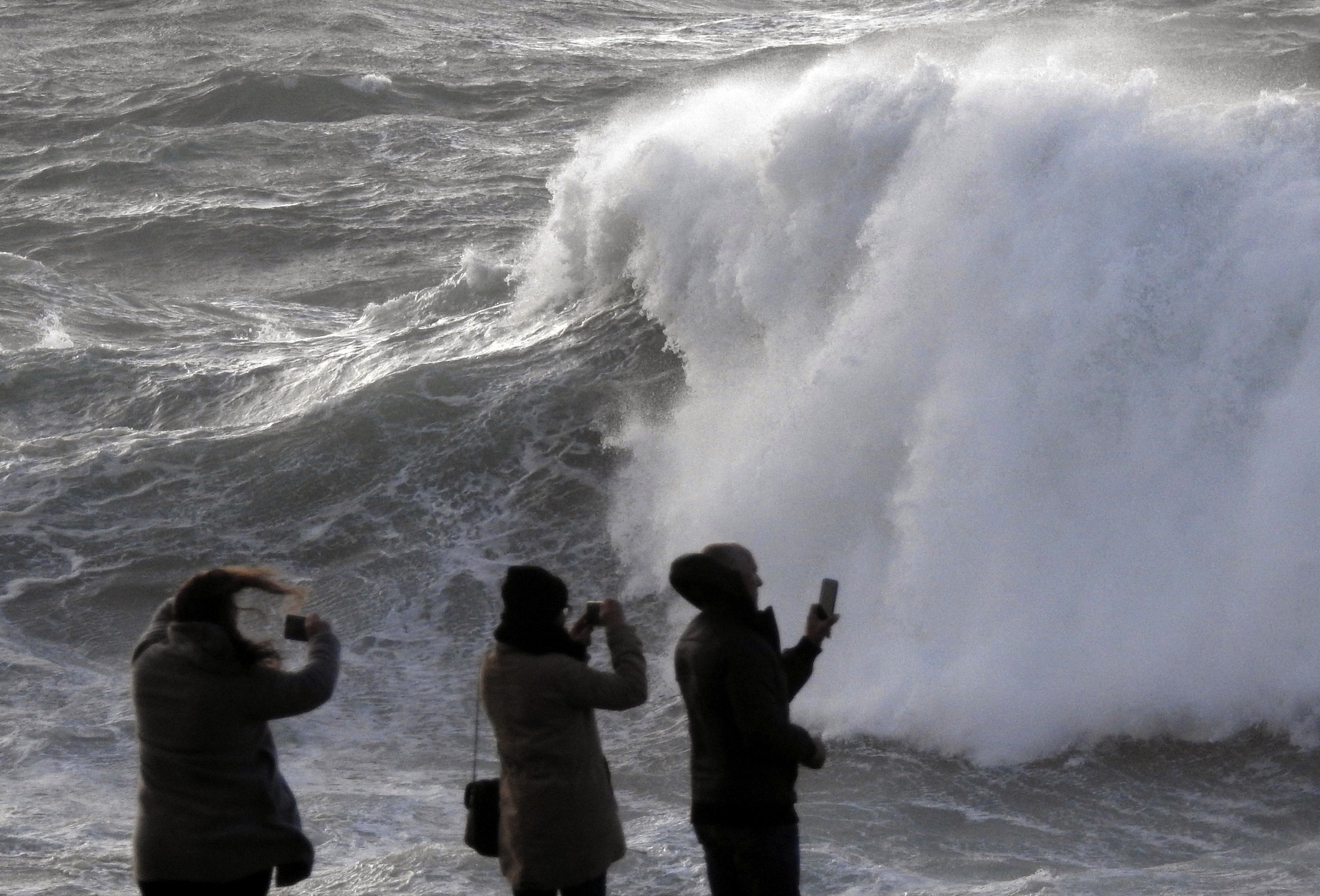 Varios turistas graban las olas esta tarde en la costa de Muxía (La Coruña)