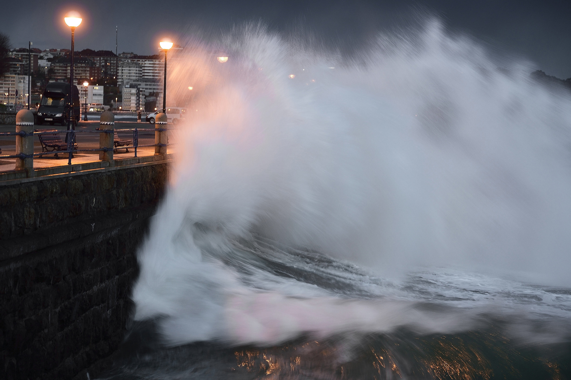Una ola rompe en el aparcamiento de la playa del Camello, en Santander, donde las alertas por temporal costero y viento fuerte continuarán activas durante el fin de semana.