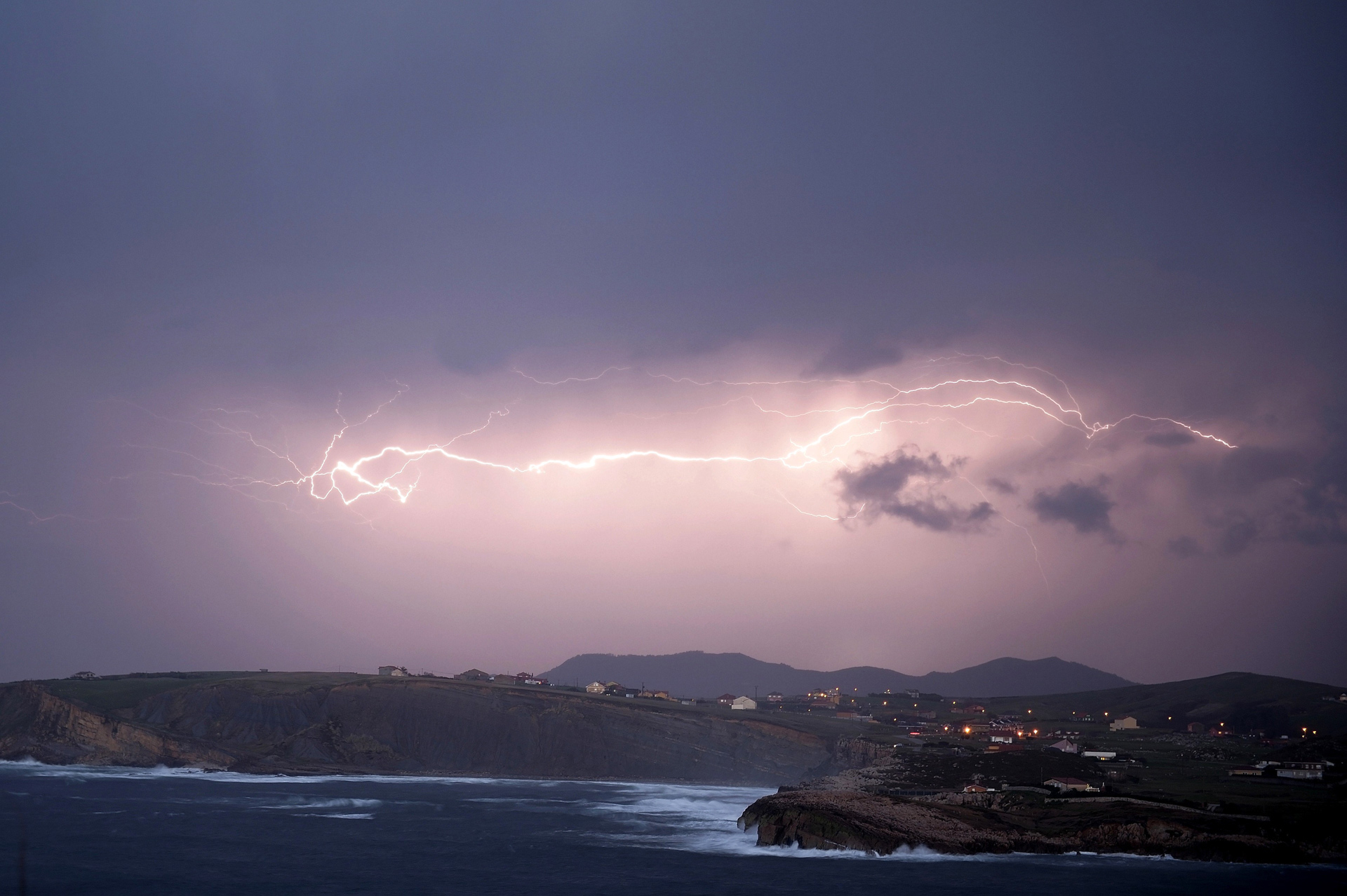Un relámpago visto desde la localidad de Suances en Cantabria, una comunidad que se encuentra en alerta naranja por fenómenos costeros adversos.