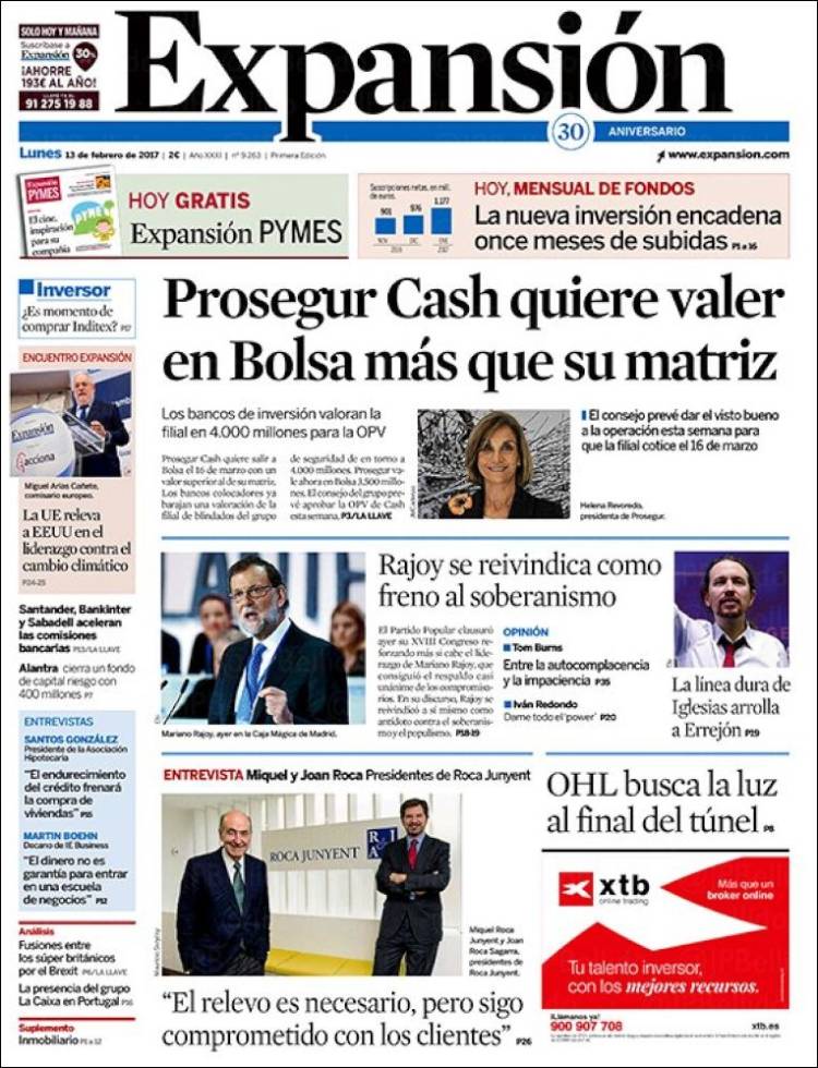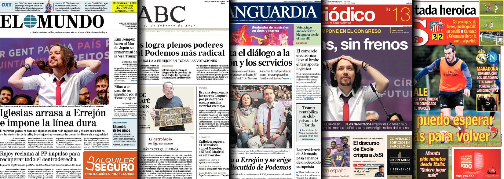 Portadas de los diarios El Mundo, El País, ABC, La Razón, La Vanguardia, El Periódico, Cinco Días, El Economista, Expansión, As, Mundo Deportivo y Sport.