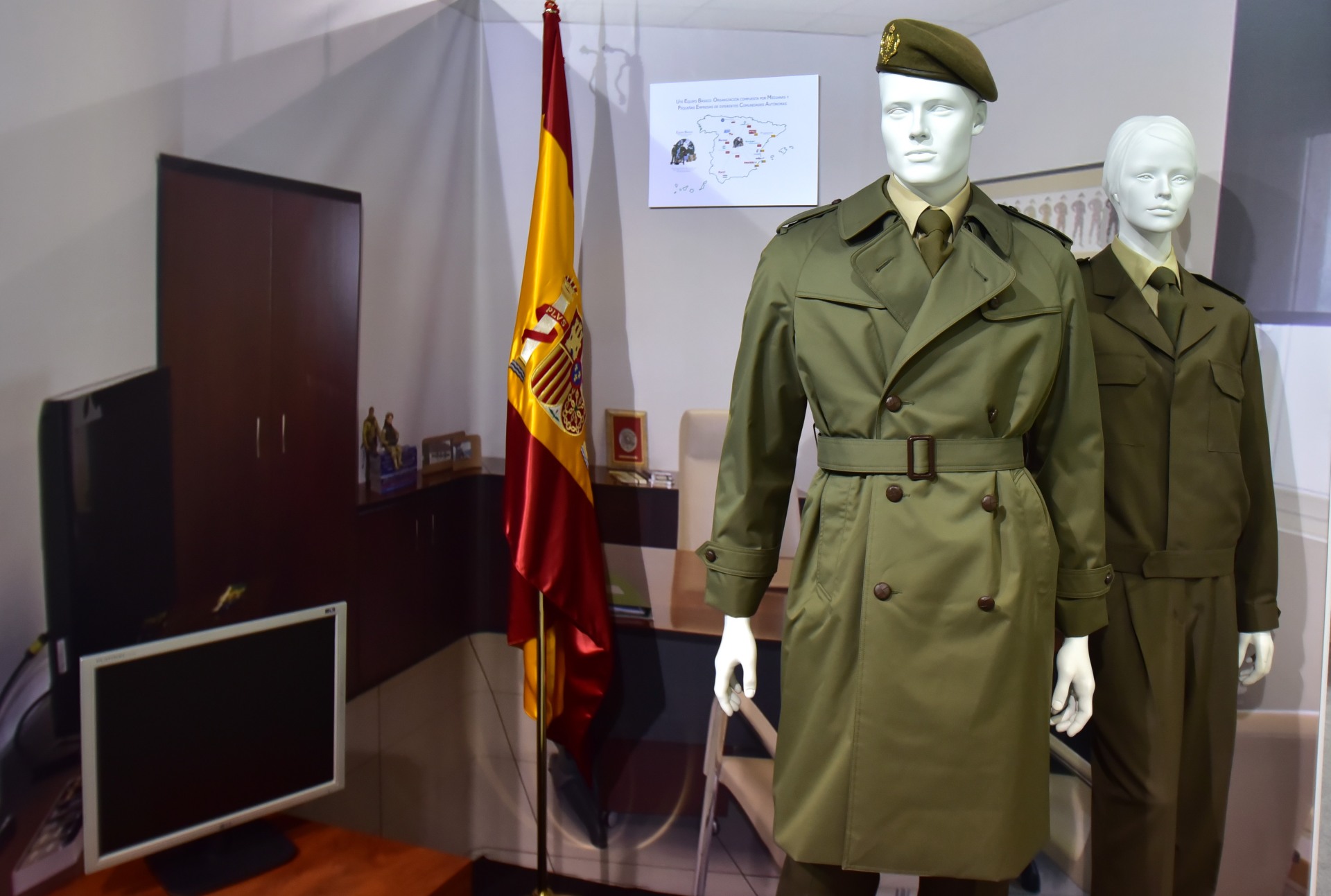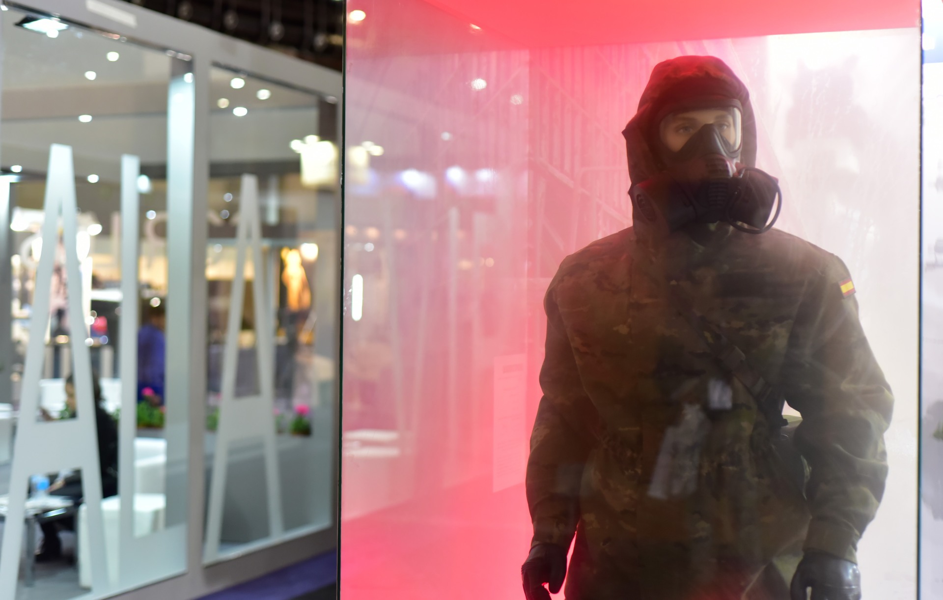 Una vitrina de cristal encierra a un maniquí vestido con el traje de protección NRBQ.