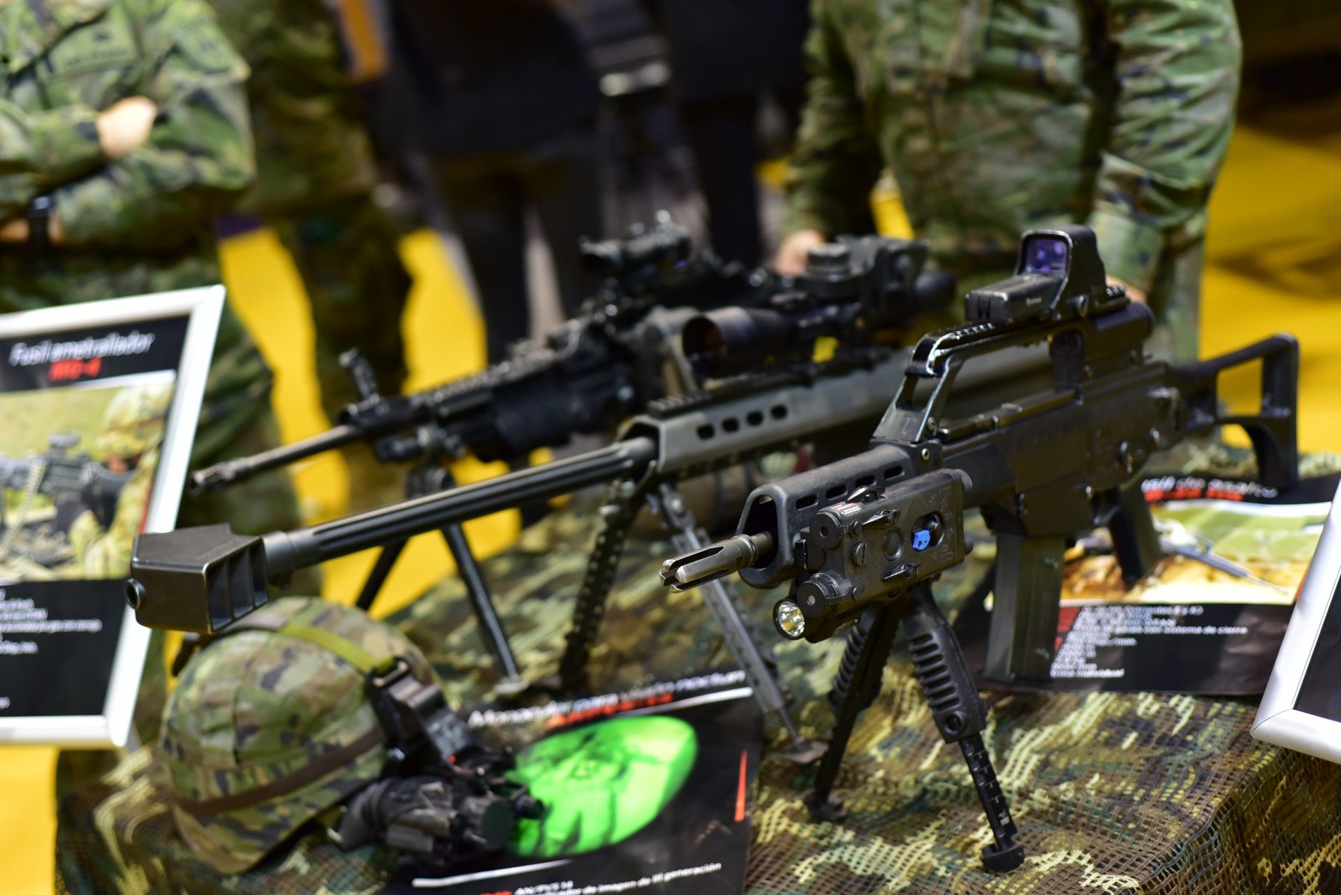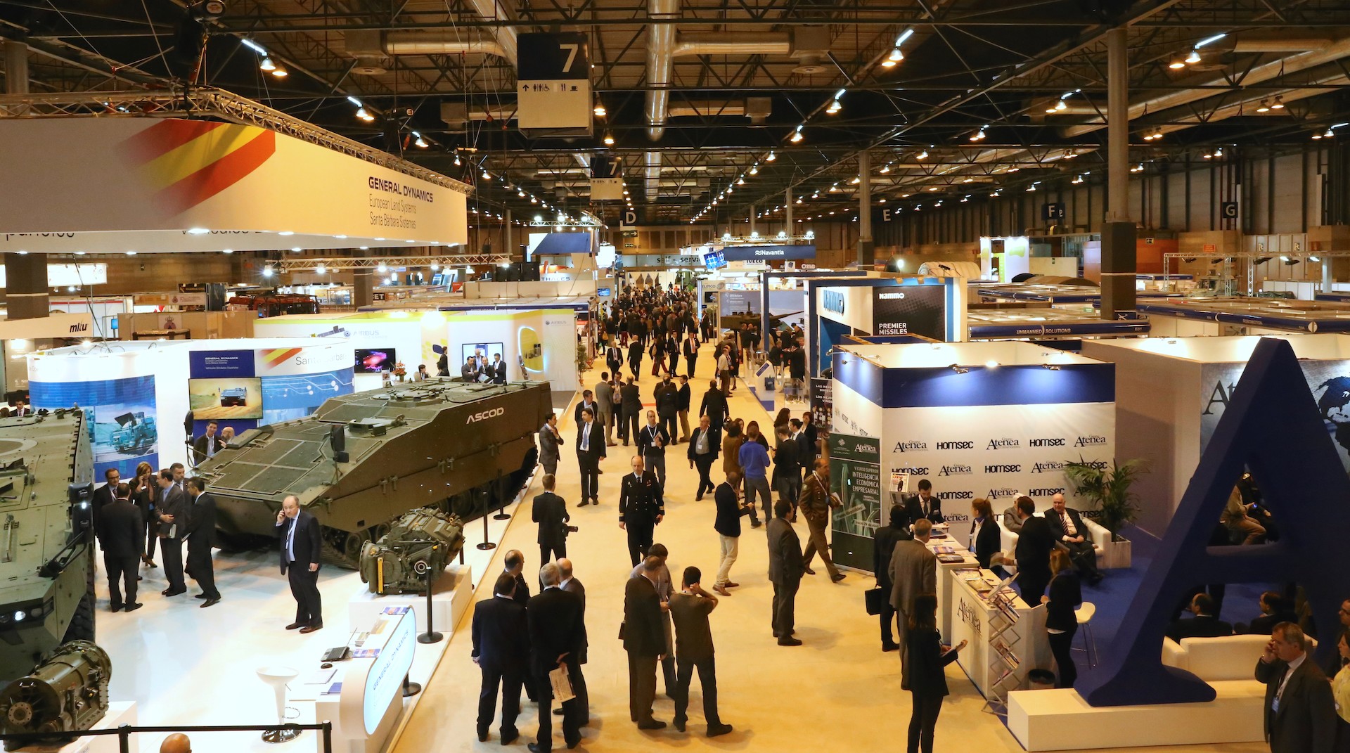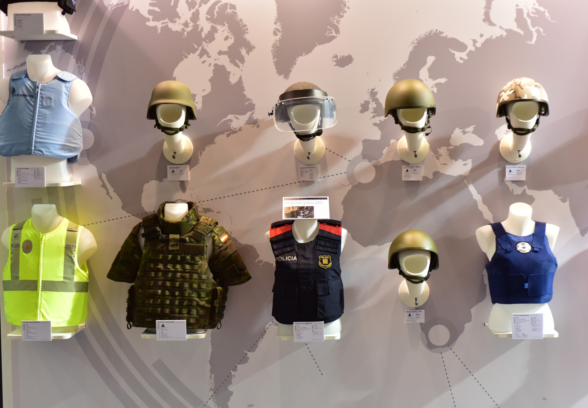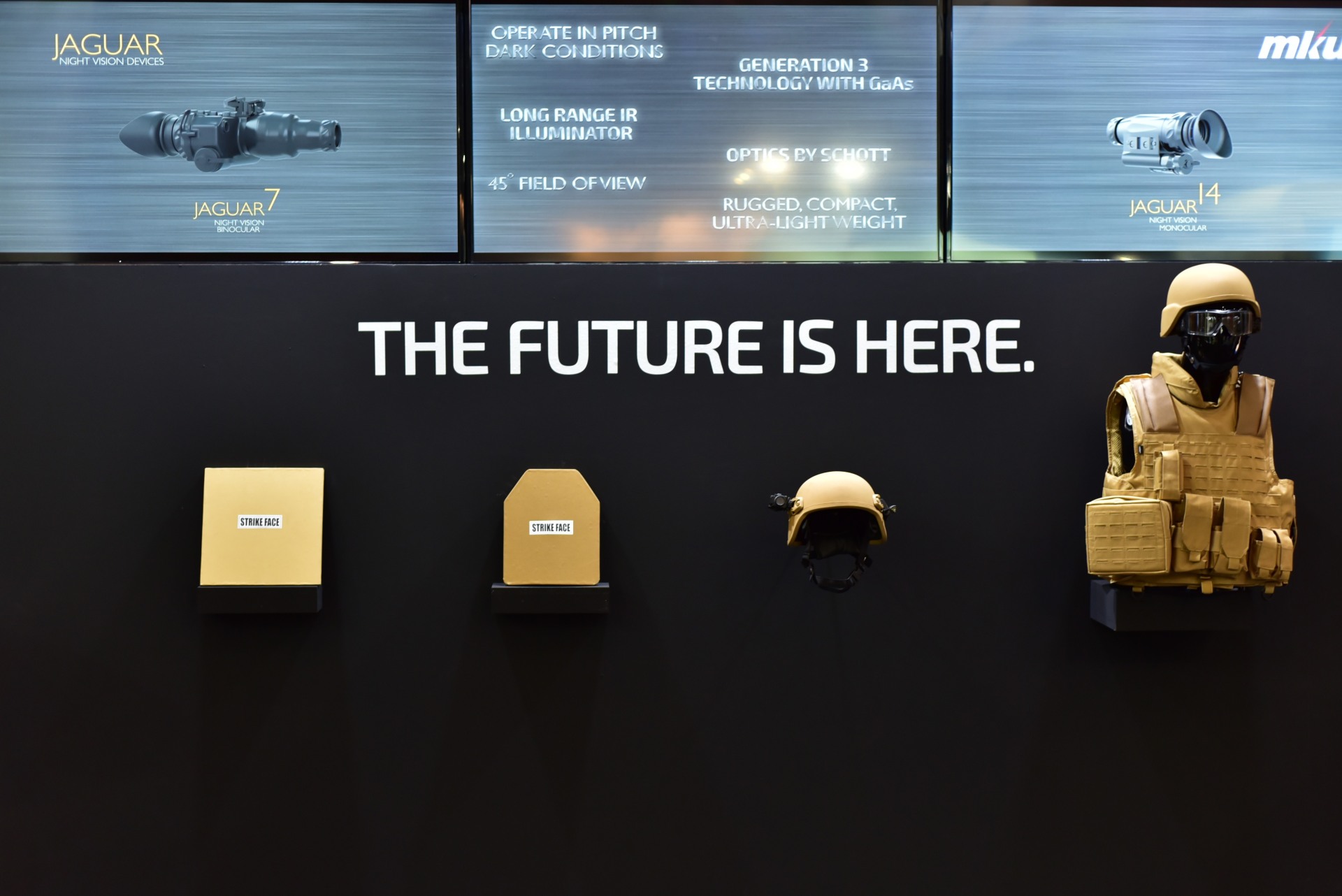 "El futuro está aquí", se puede leer en uno de los eslóganes en el stand de una empresa dedicada a fabricar materiales militares antibalas.