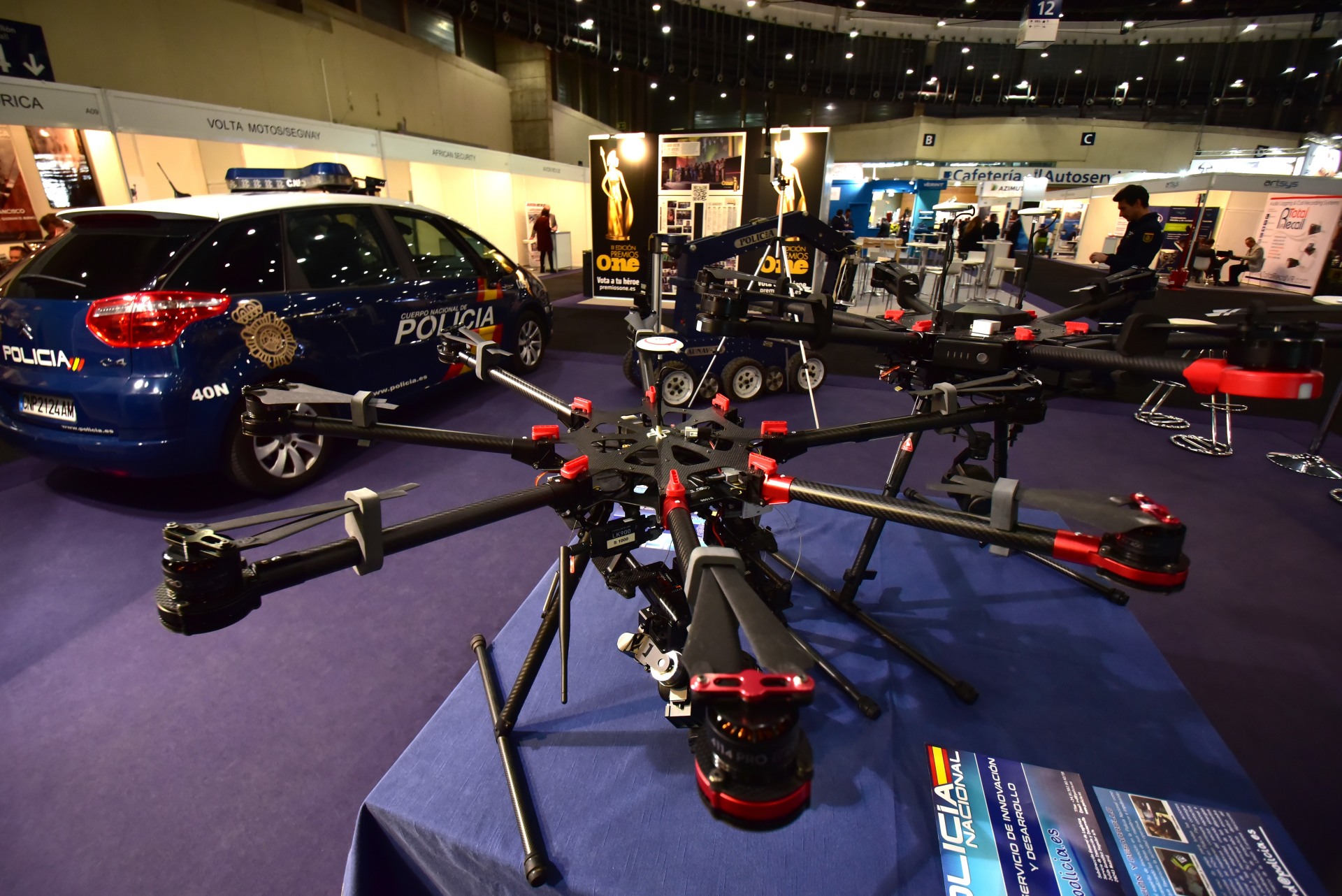 Stand de la Policía Nacional, con un patrulla Z, un pequeño dron y un robot desactivador de explosivos.