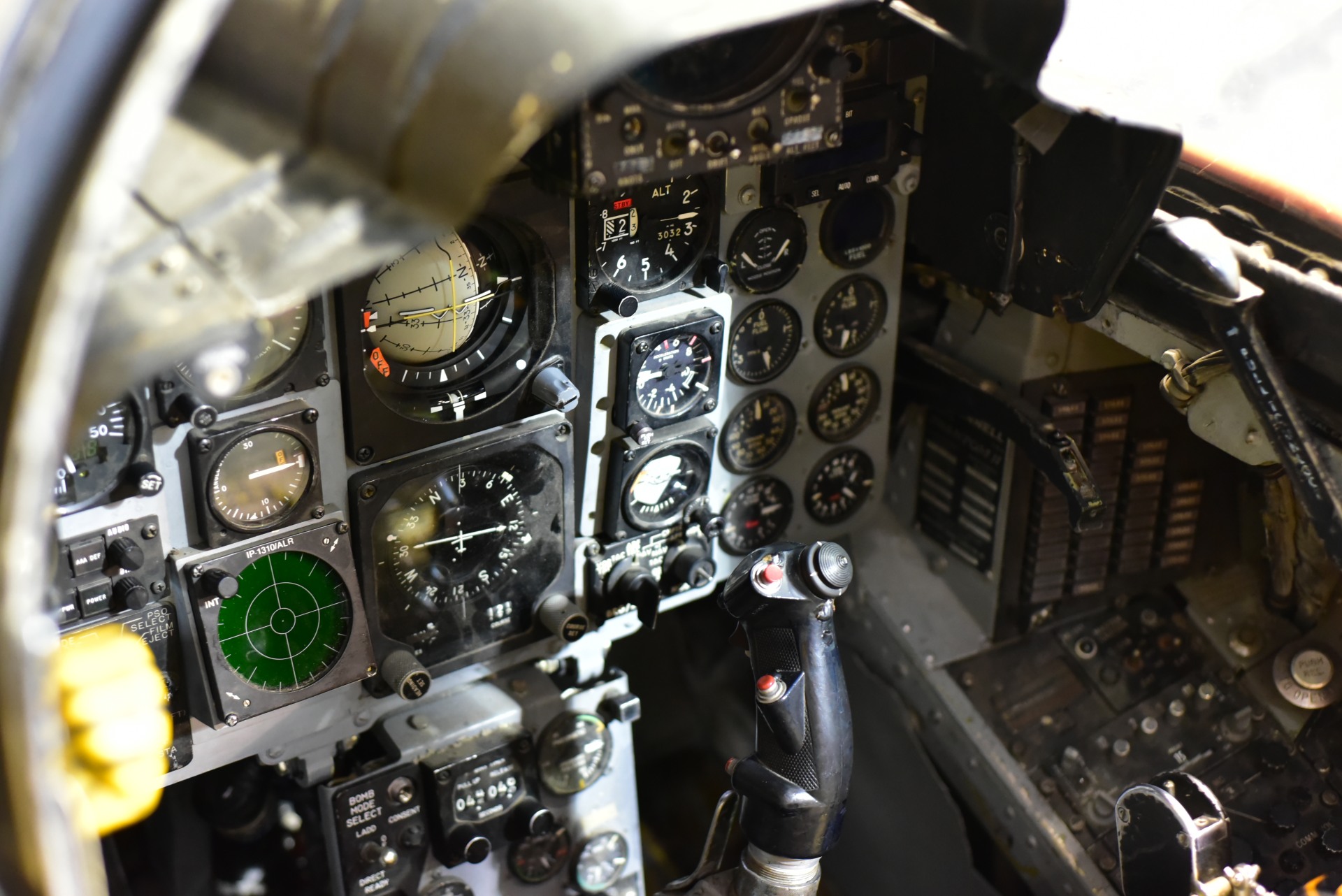 El complicado panel de mandos de un avión caza F-4 Phantom II del Ejército del Aire. Un detalle visto de cerca en la feria Homsec 2017.