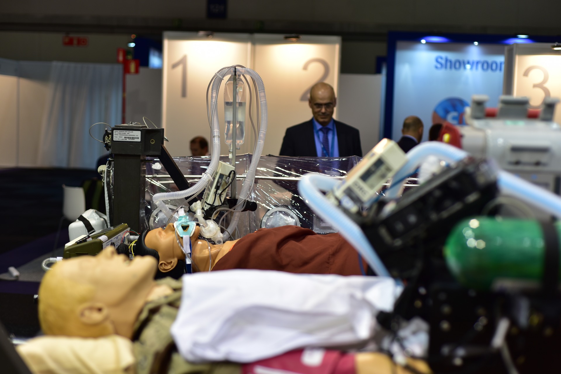 Un hombre observa a dos modelos de maniquíes postrados en dos camillas médicas militares. D.A.