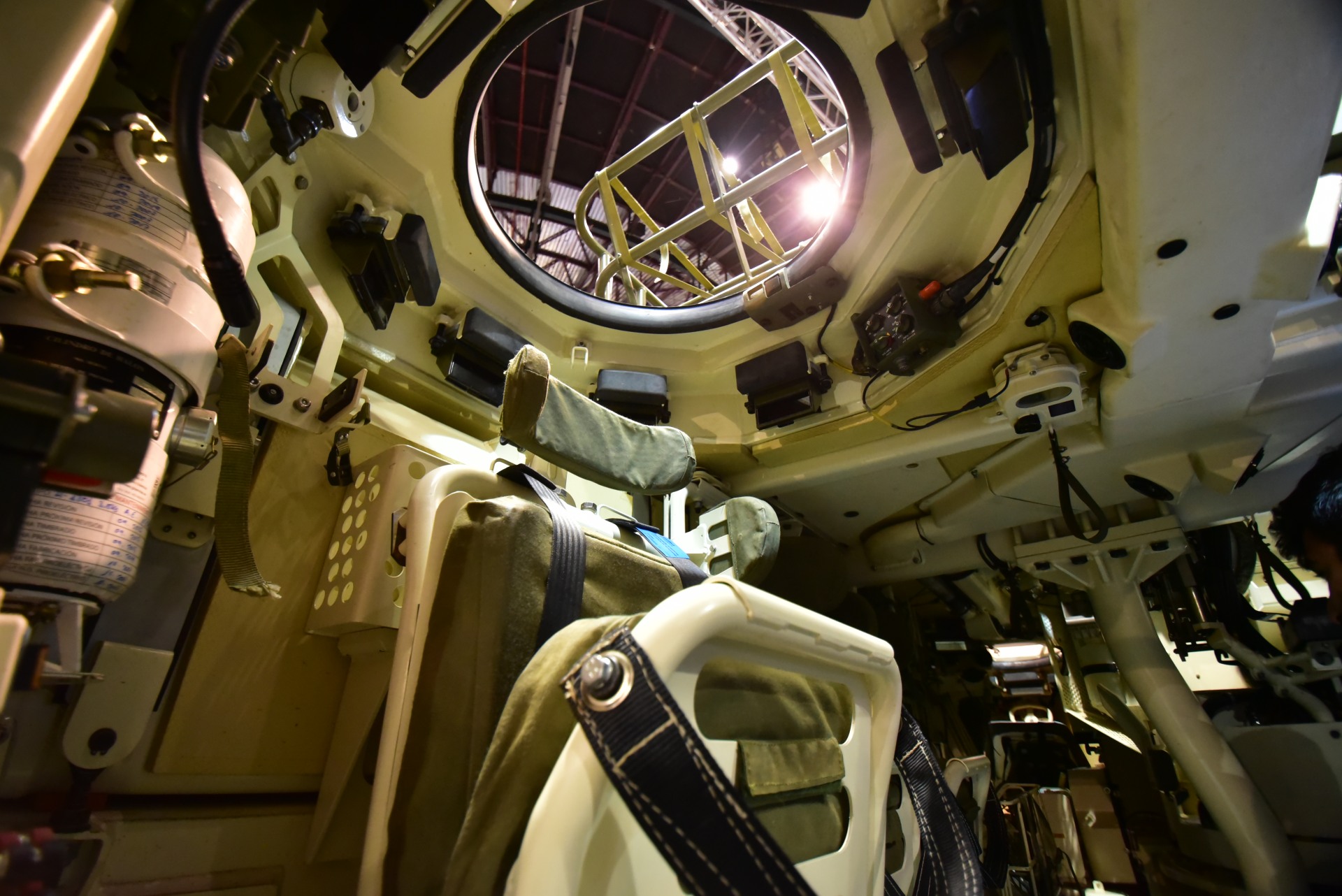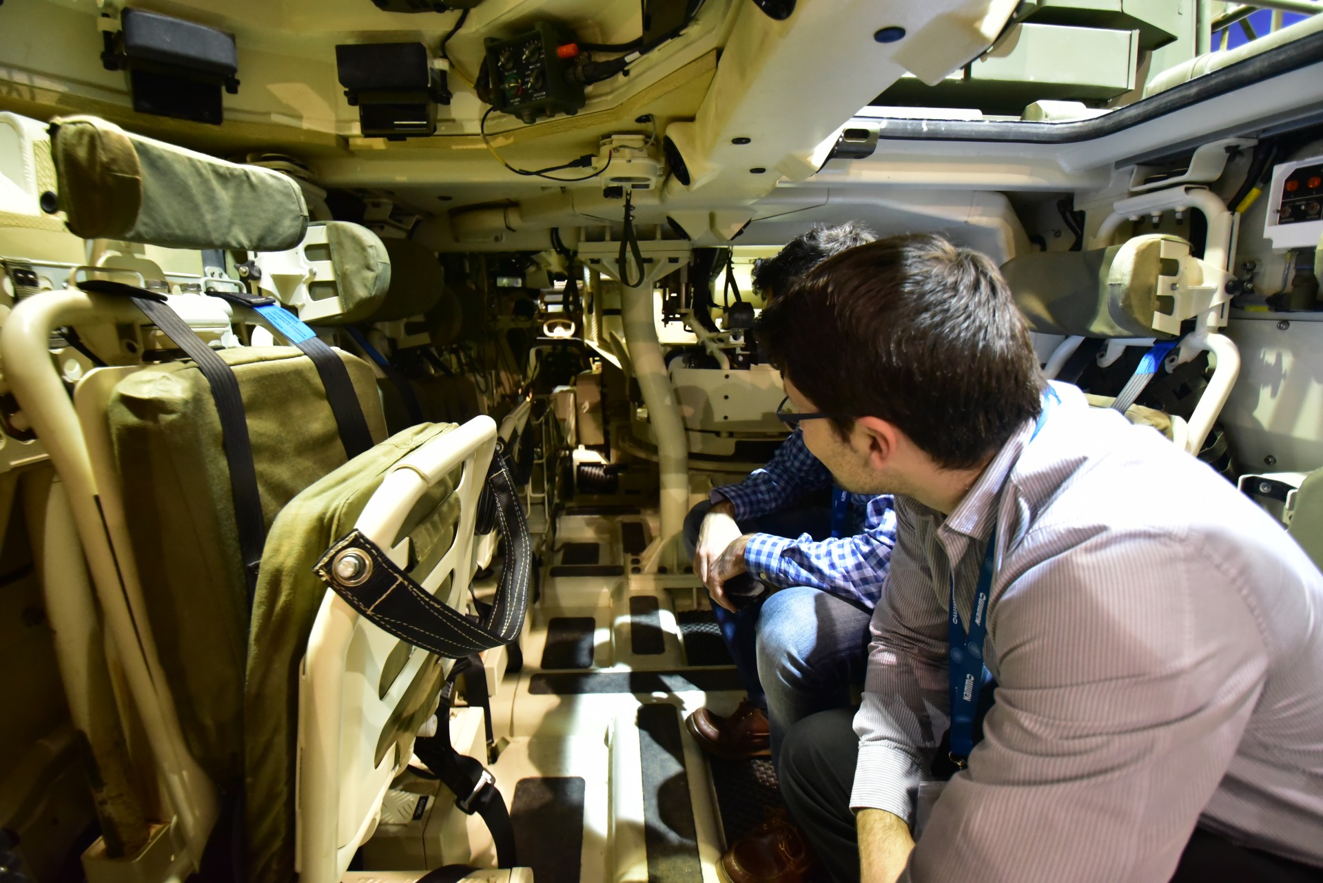 Dos visitante a Homsec observan los detalles del interior de un blindado Pizarro II VCI.