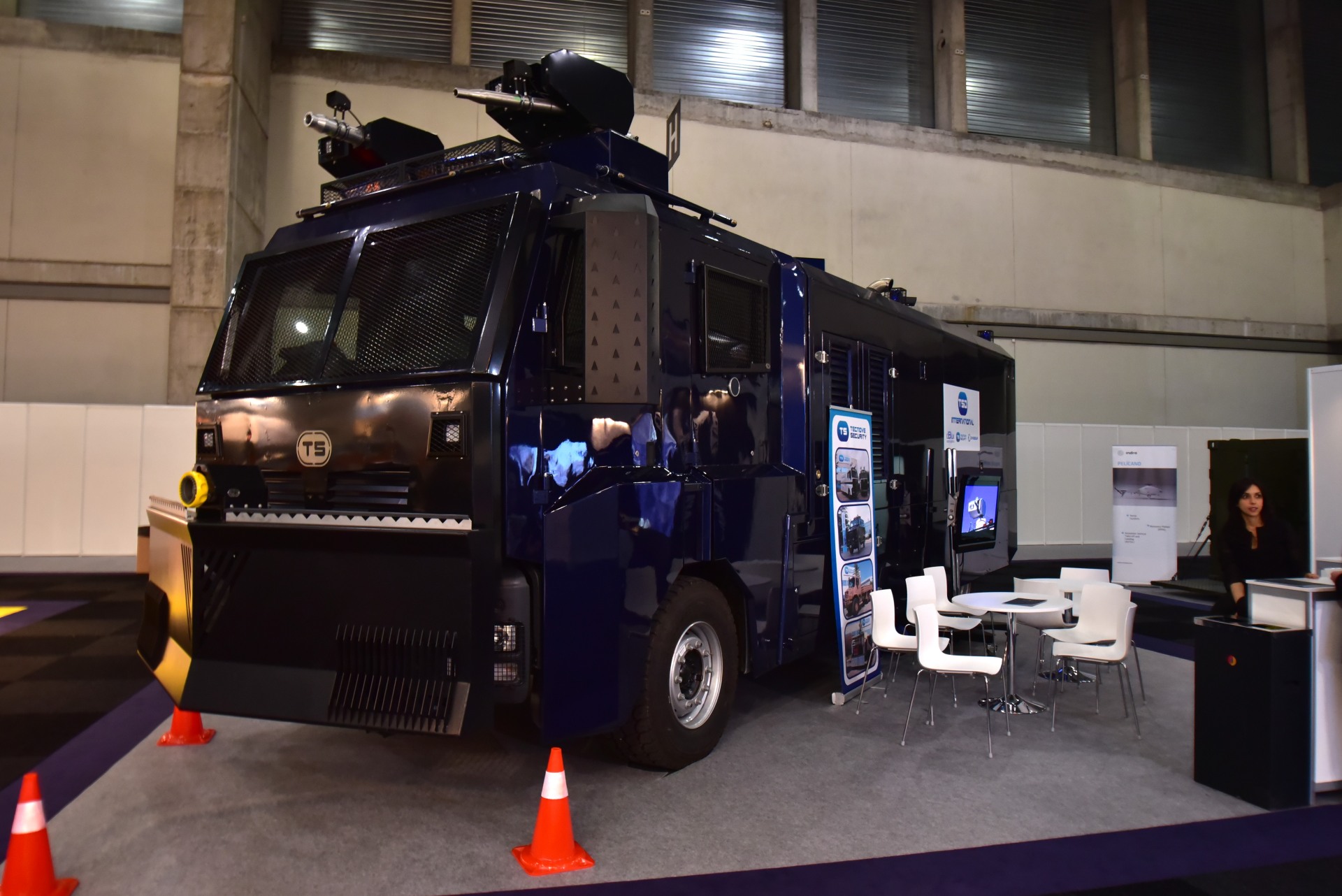 Sin duda el vehículo más grande que se puede ver en la feria Homsec 2017. Diseñado para cuerpos de seguridad como la Policía. Es destacable el detalle de las mangueras de agua a presión situadas en la parte de arriba.