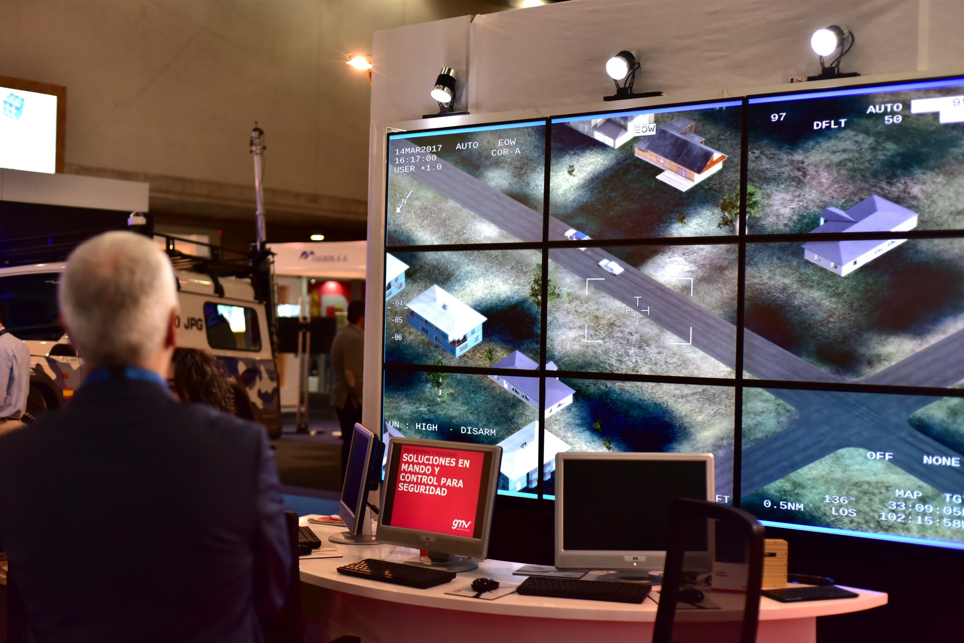El sistema Gecko (izquierda) y el sistema de mando y control Horus al fondo en el stand de Thales.