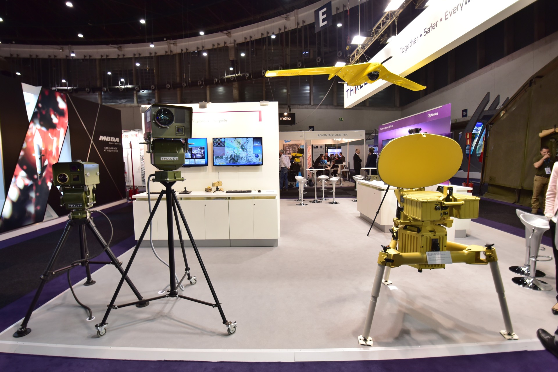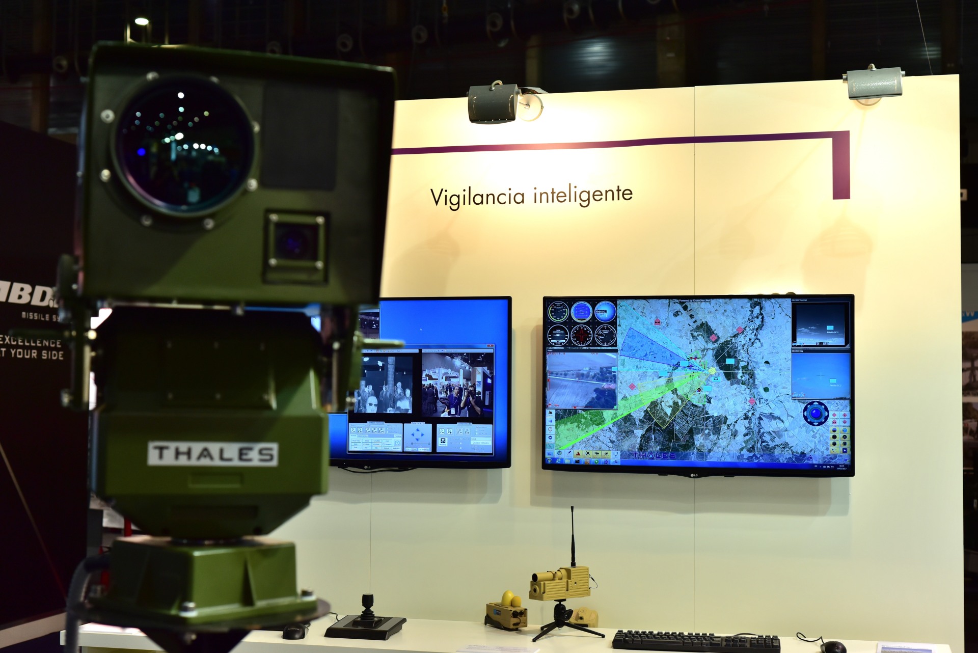 Stand de Thales, con el Observer 80 (derecha), dos Gecko (izquierda) y el sistema de mando y control Horus al fondo.