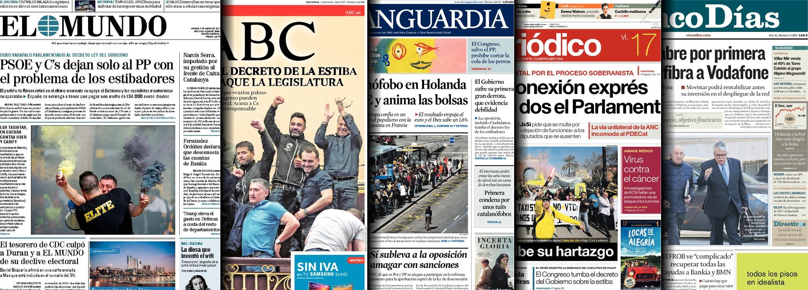 Portadas de los diarios ABC, As, Cinco Días, El Periódico y La Vanguardia.
