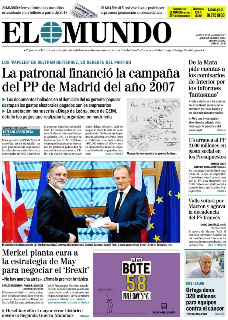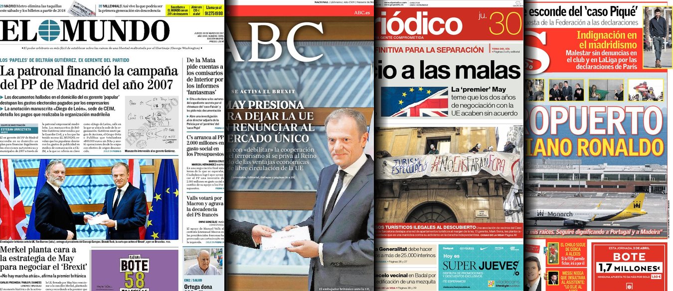 Portadas de los diarios El Mundo, El País, ABC, La Razón, La Vanguardia, El Periódico, Cinco Días, El Economista, As, Mundo Deportivo y Sport