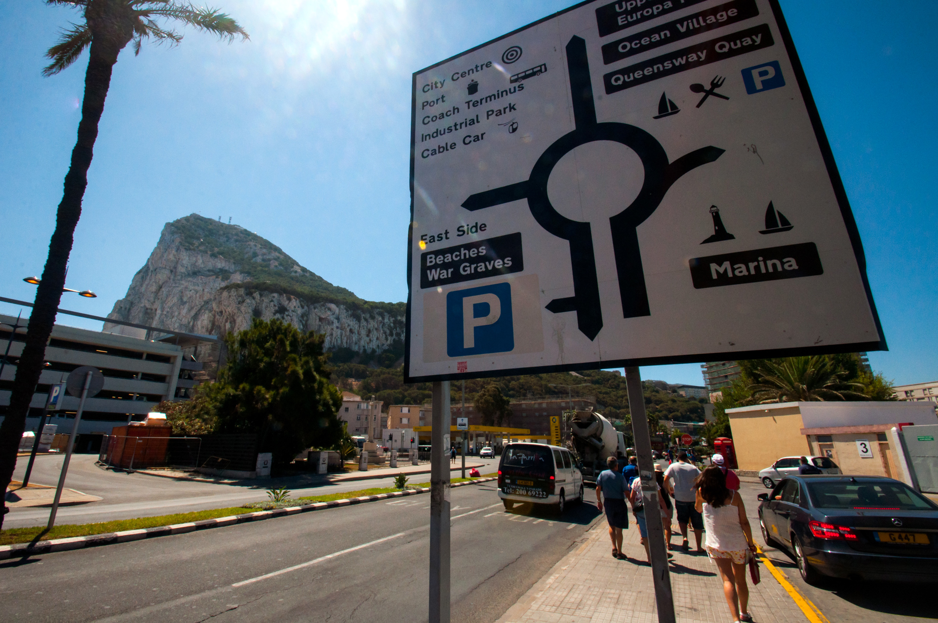 Después de pasar la llamada zona neutral, comienza la parte urbanizada del peñón. Una señal de tráfico en inglés indica una rotonda. En el peñón se conduce por la derecha, al contrario que en el Reino Unido.