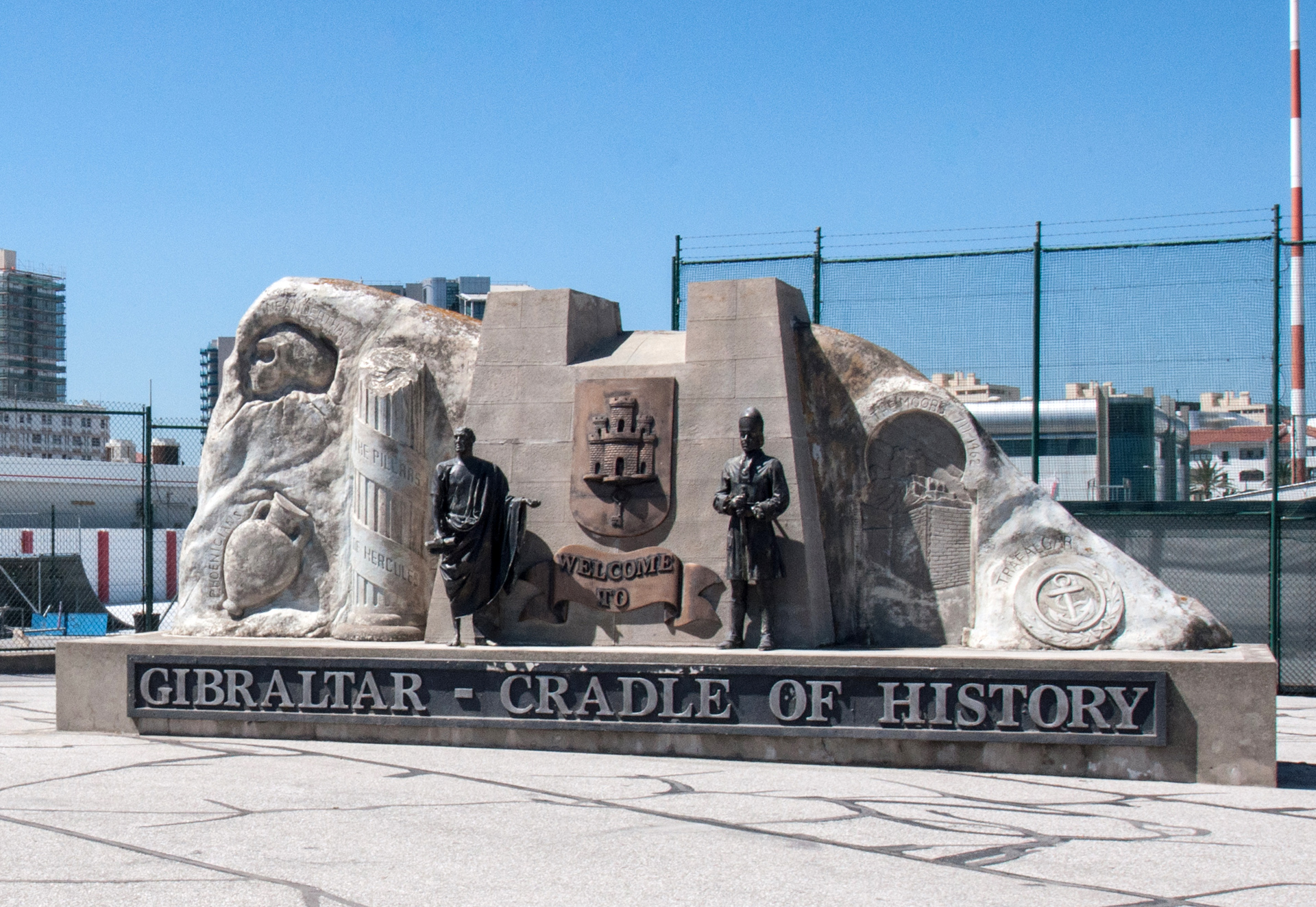 La estatua que da la bienvenida a Gibraltar donde se puede leer "Gibraltar - Cradle of history", "Gibraltar, cuna de la historia".