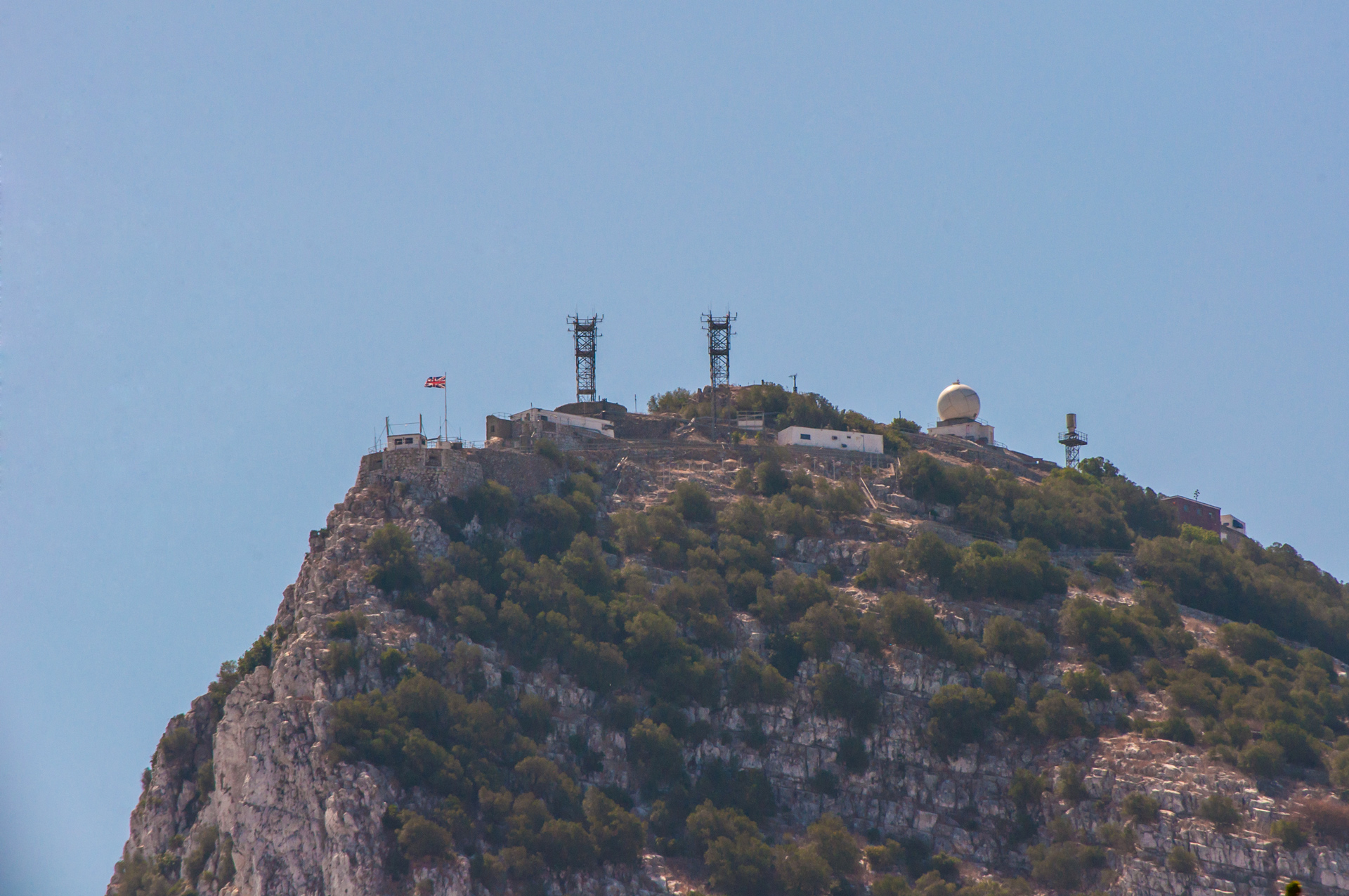 En lo más alto del peñón de Gibraltar se levantan varias torres de comunicaciones y la bandera del Reino Unido.