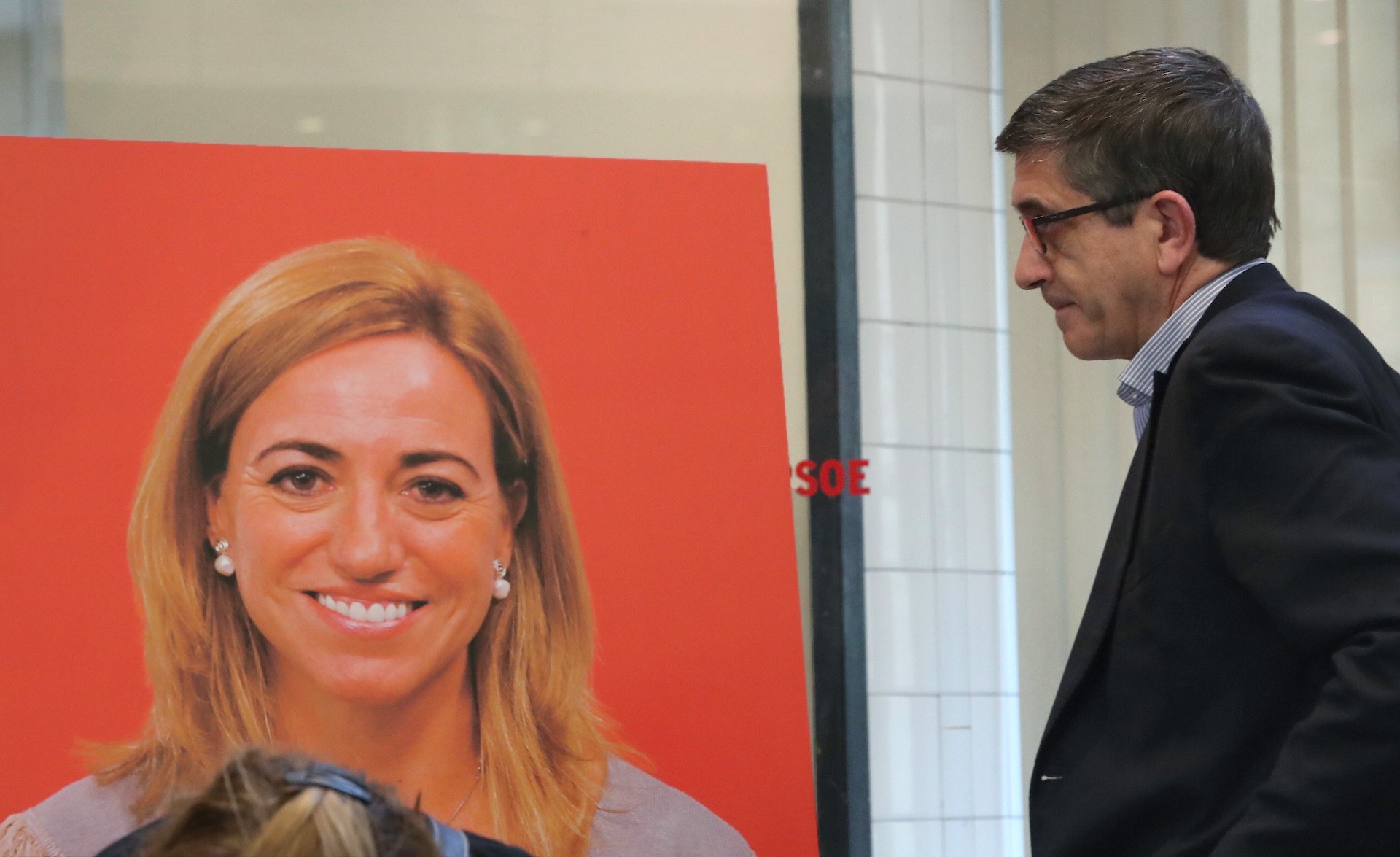 Patxi López ante uno de los retratos de Chacón en la sede del PSOE