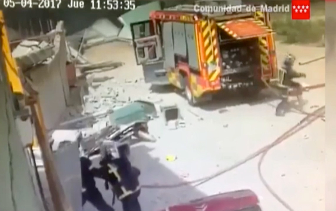 Según se observa en el vídeo, los bomberos llegan a la planta industrial de Arganda y cuando iban a entrar en la nave, se ven sorprendidos por una gran explosión de la que escapan de milagro.