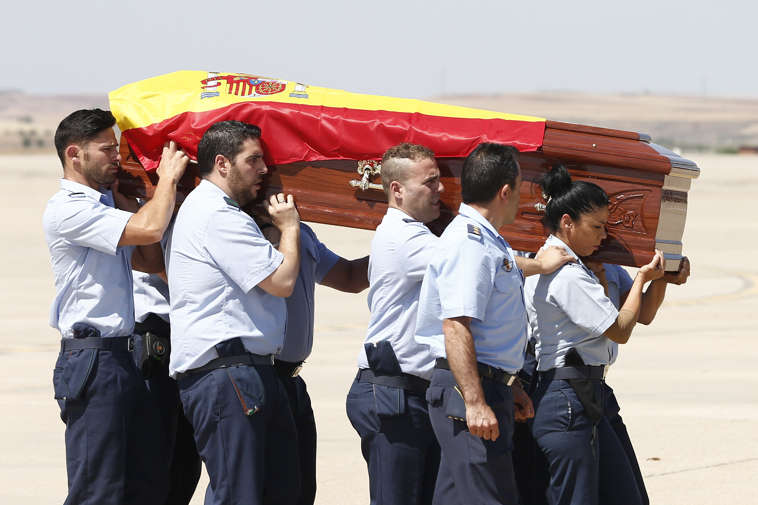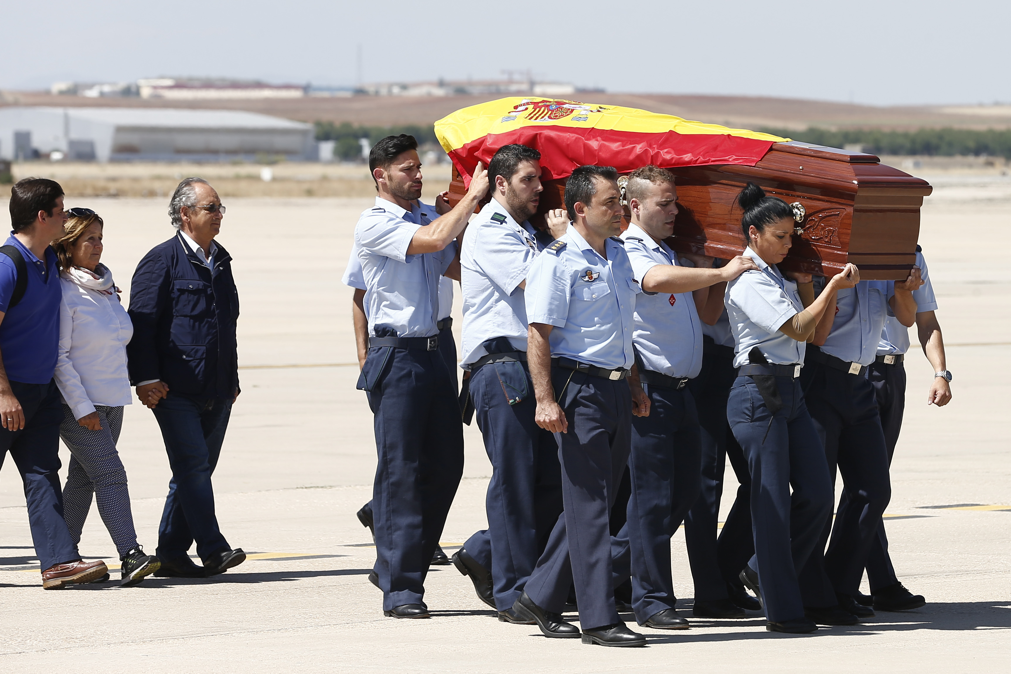 El féretro con los restos mortales de Ignacio Echeverría llega a España y es trasladado desde el avión militar por miembros de las Fuerzas de Seguridad del Estado.
