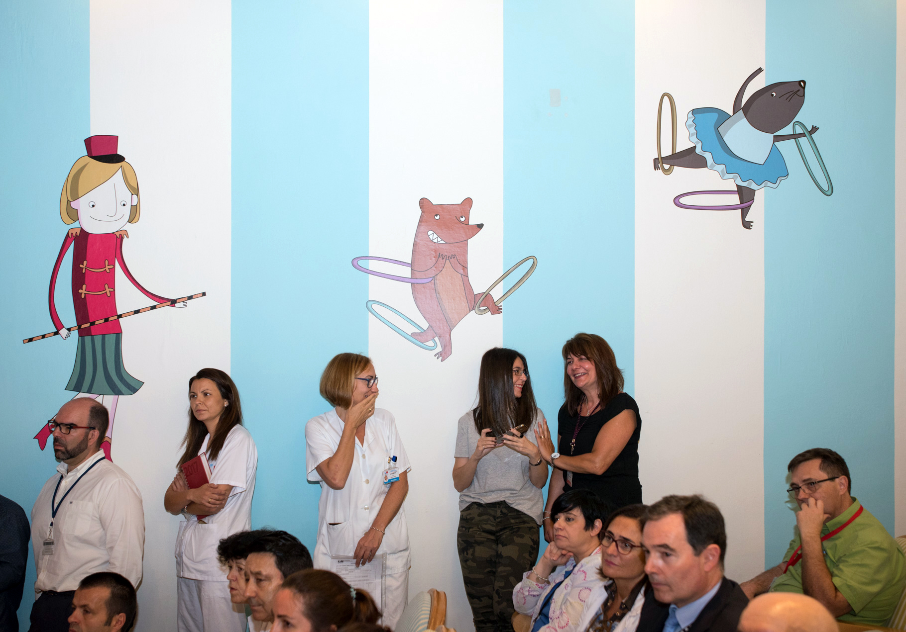 Las paredes del auditorio teatro del hospital Niño Jesús decoradas con motivos infantiles y colores vivos.