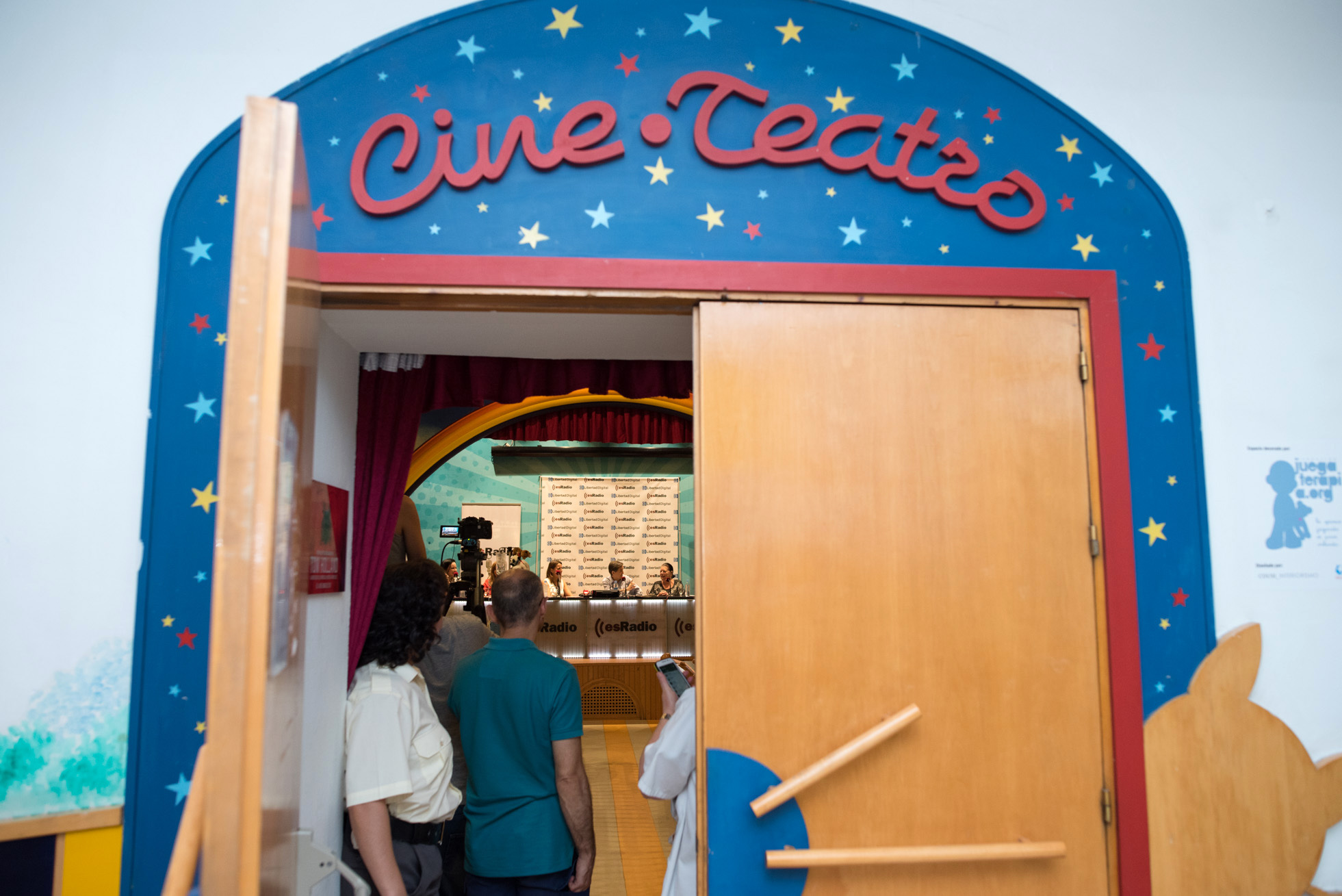 La puerta de entrada al auditorio, también cine y teatro del hospital Niño Jesús. En el interior, el programa de Es la Mañana de Federico.