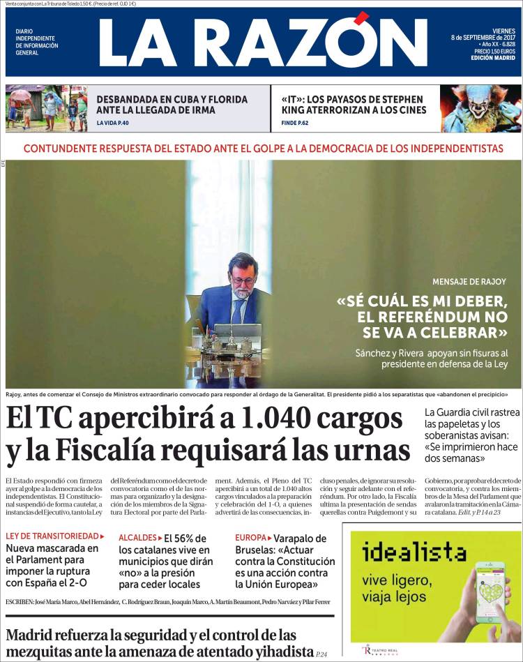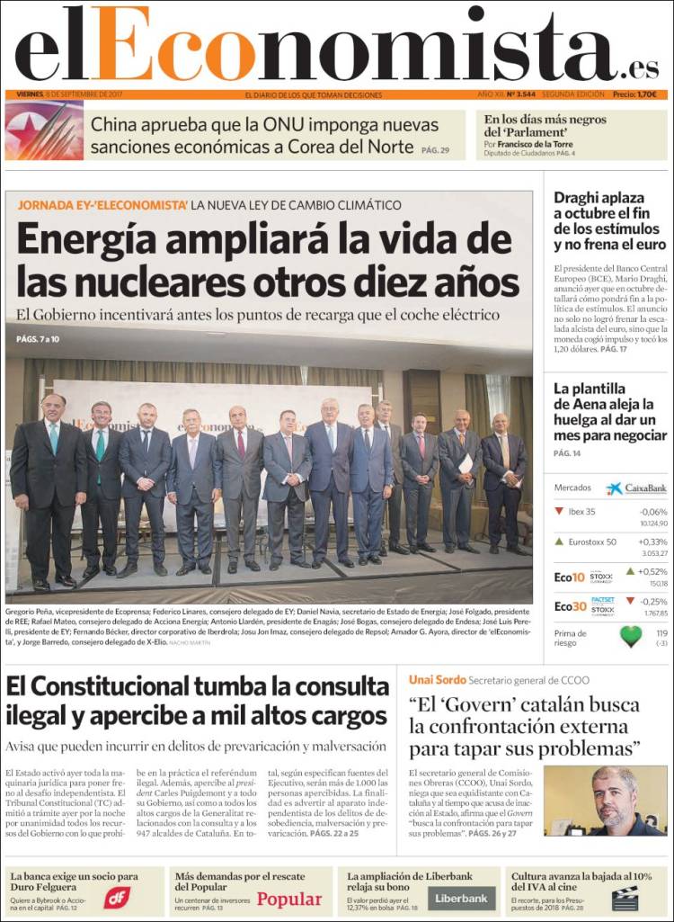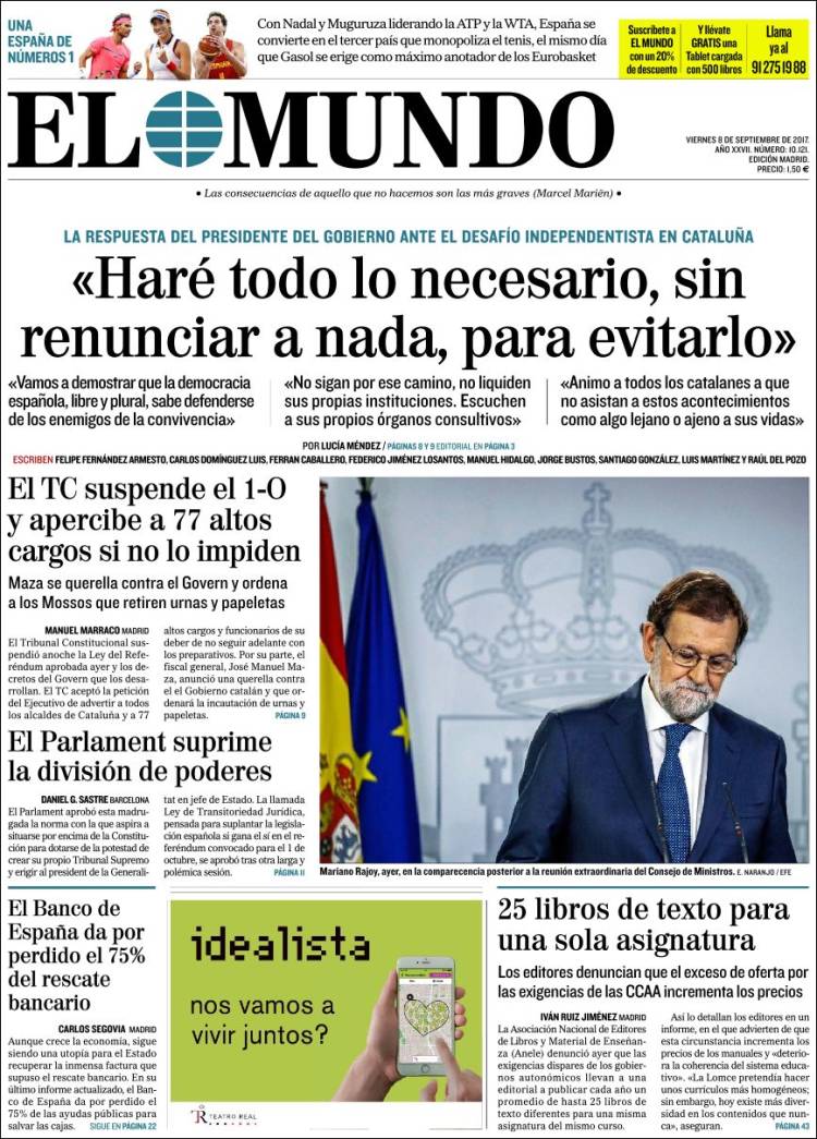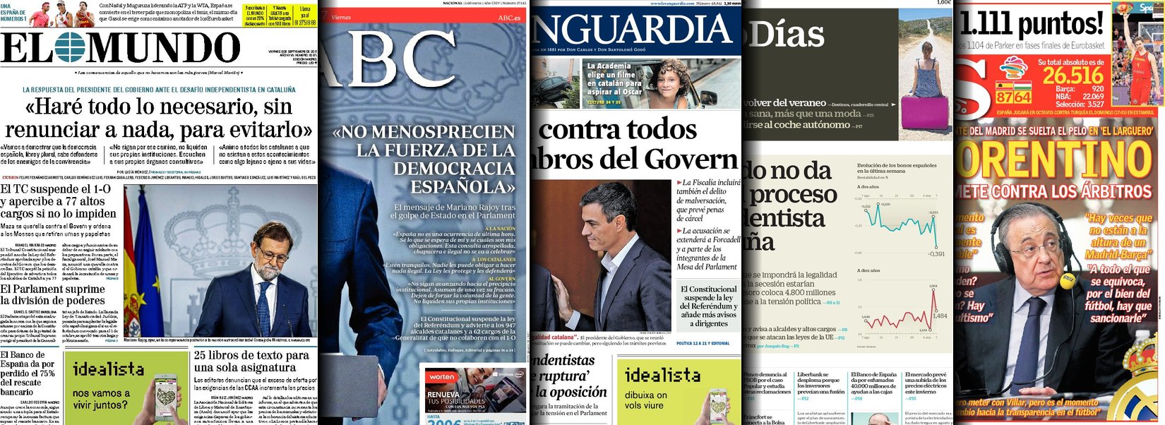 Portadas de los diarios El Mundo, El País, ABC, La Razón, La Vanguardia, El Periódico, Cinco Días, El Economista, Marca, As, Mundo Deportivo y Sport.