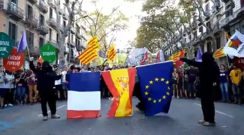 La organización Arran, una de las participantes, ha difundido vía Twitter el video en que uno de los individuos prendía fuego a las banderas en la cabecera de la marcha mientras los otros dos encapuchados las sujetaban.