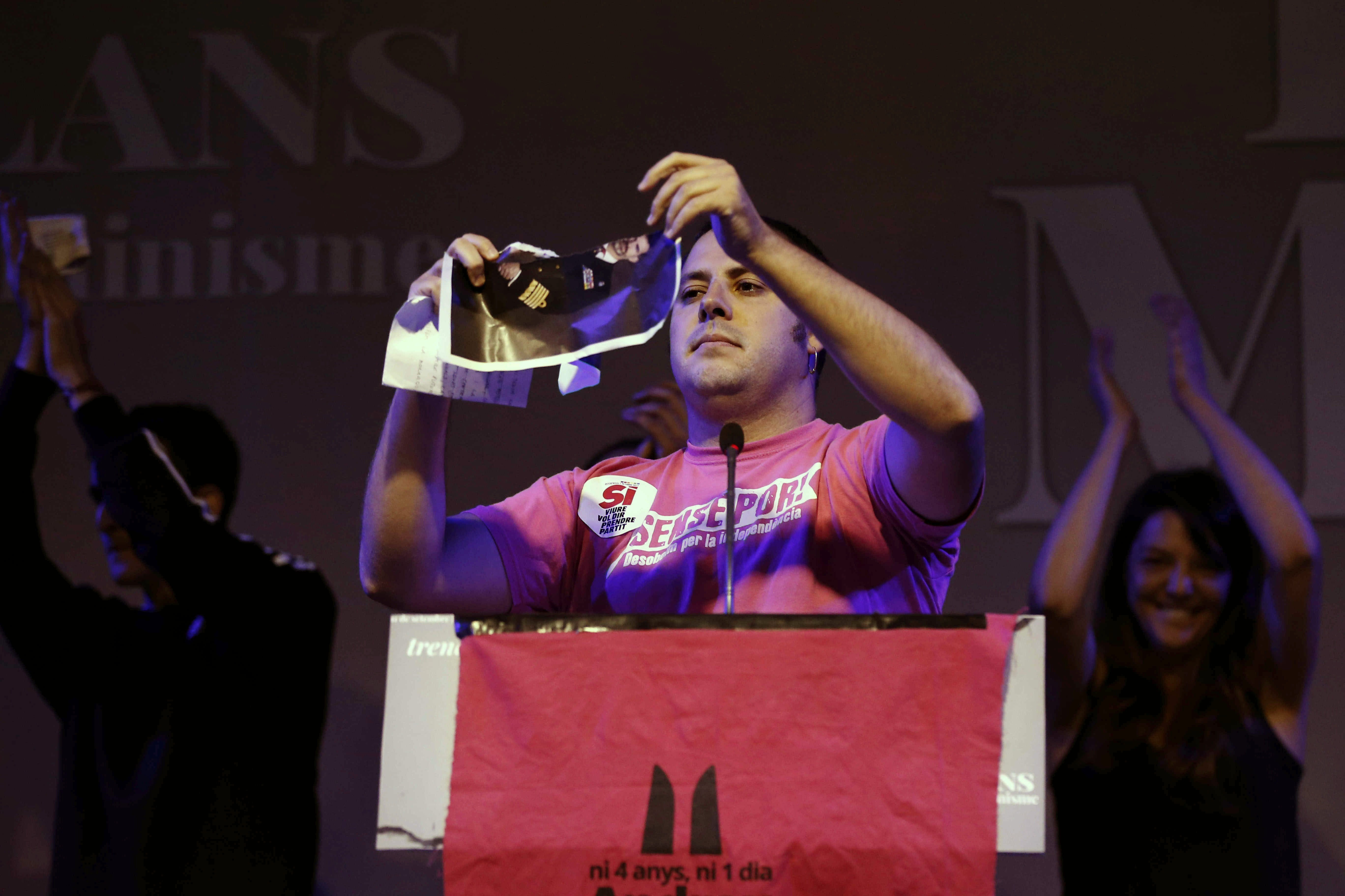 Al finalizar el acto, el joven radical Aitor Blanc ha subido al escenario y ha rasgado una fotografía de Felipe VI a pesar de ser consciente de que es delito.