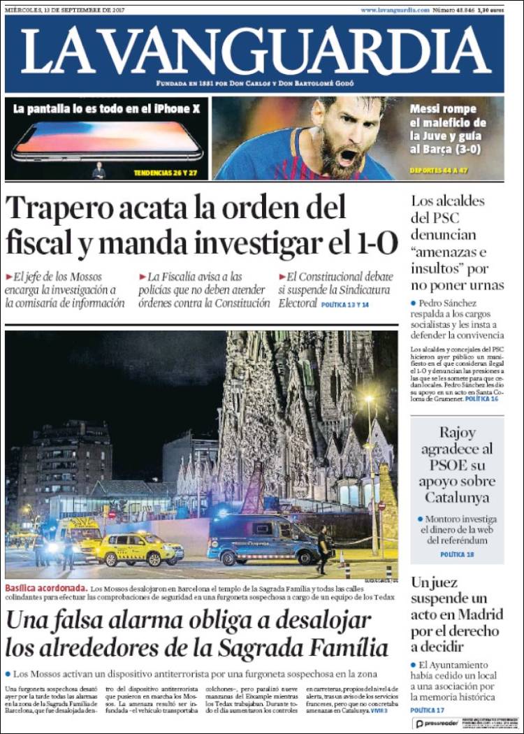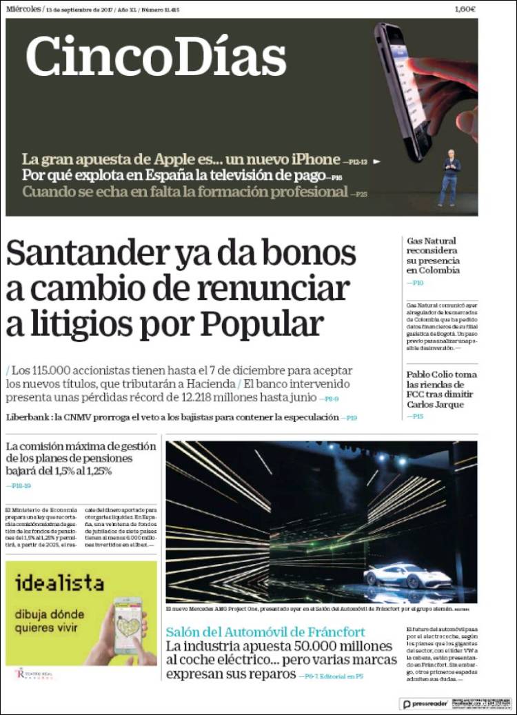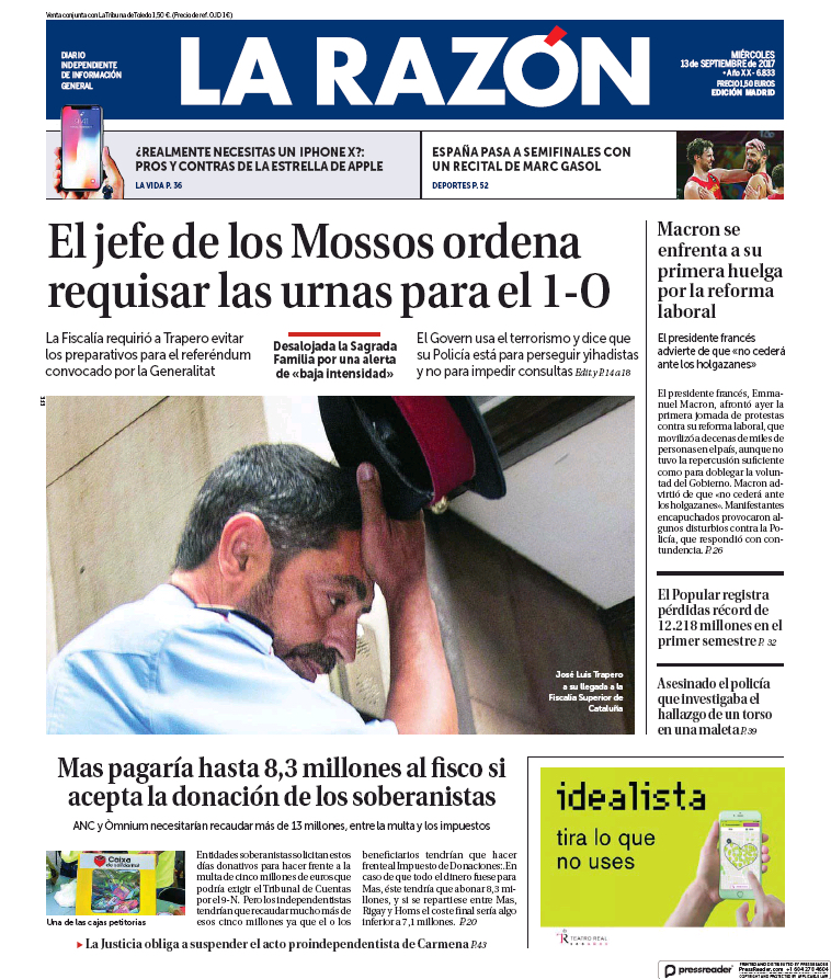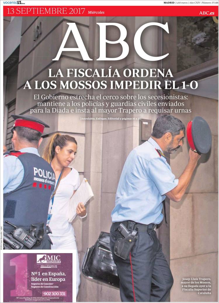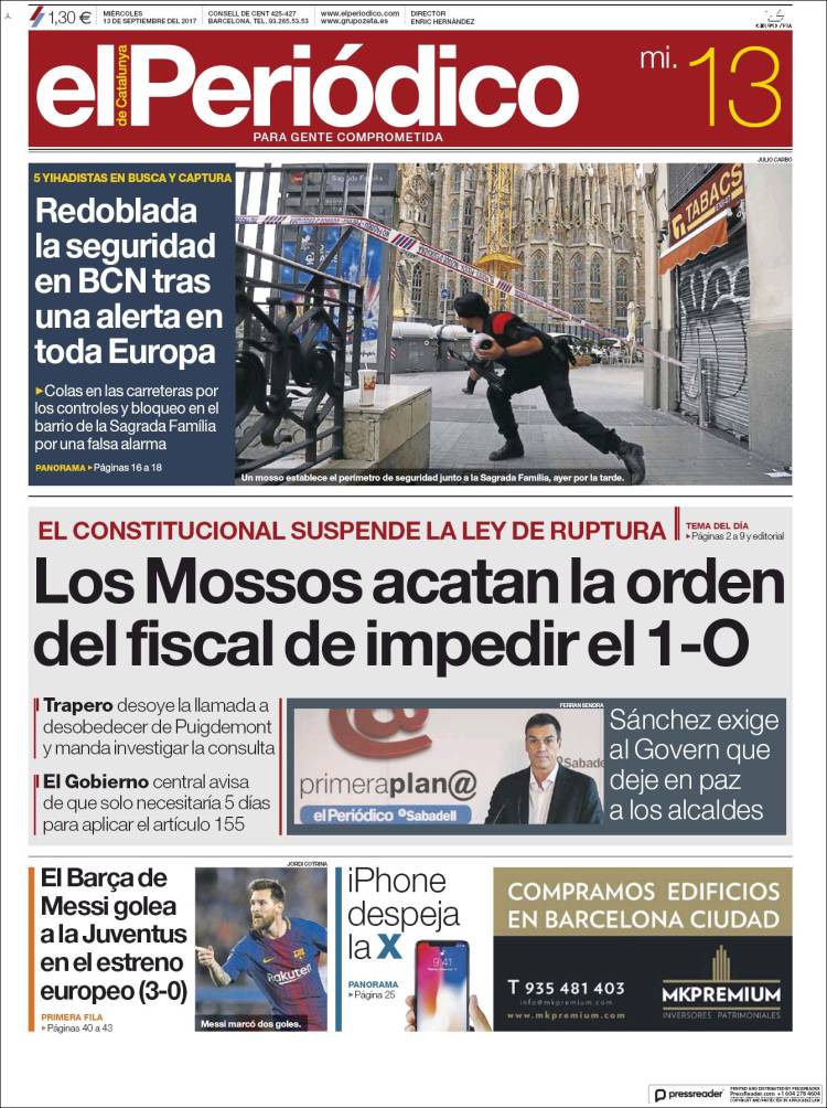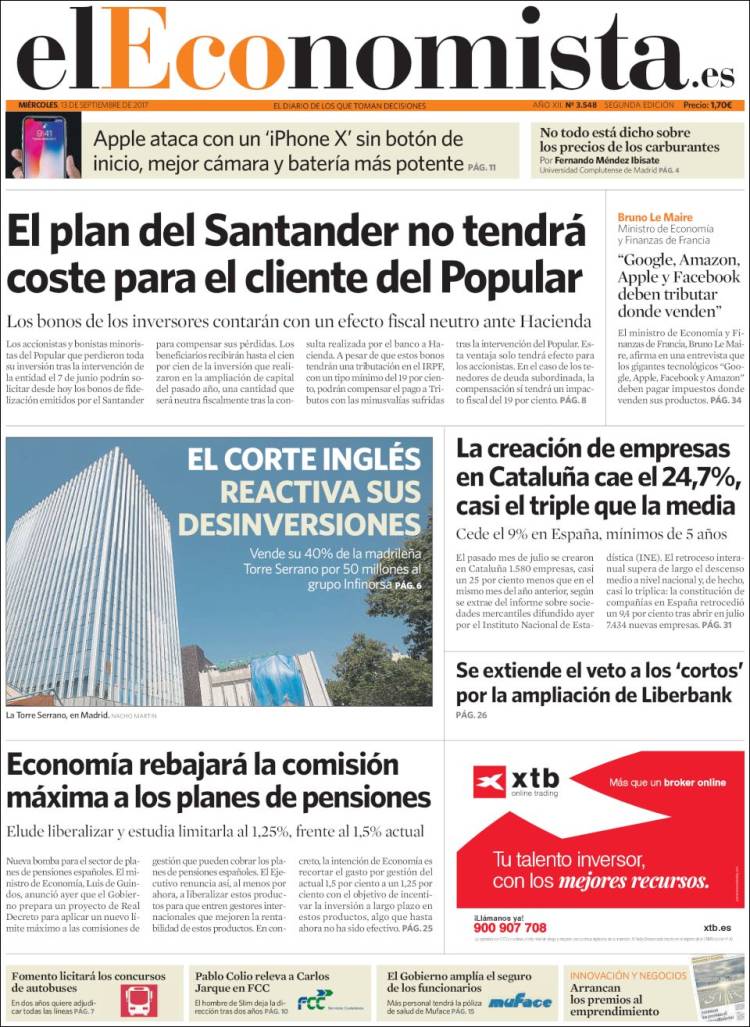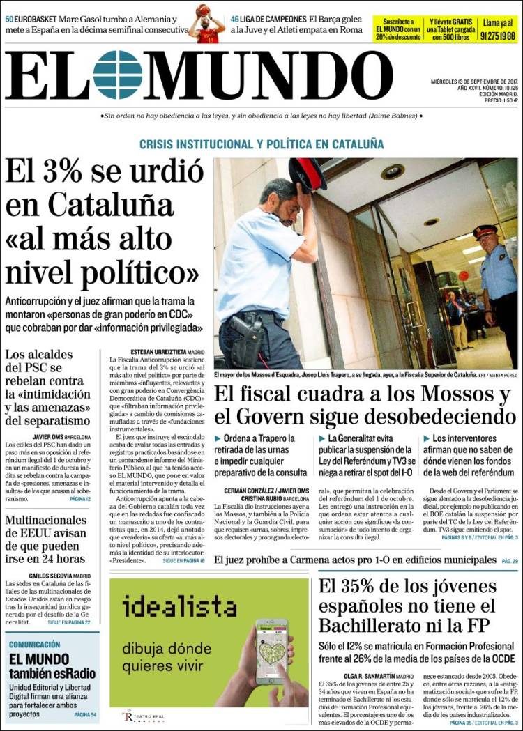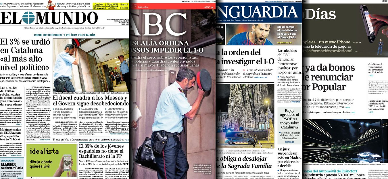 Portadas de los diarios El Mundo, El País, ABC, La Razón, La Vanguardia, El Periódico, Cinco Días, El Economista, Marca, As, Mundo Deportivo y Sport.