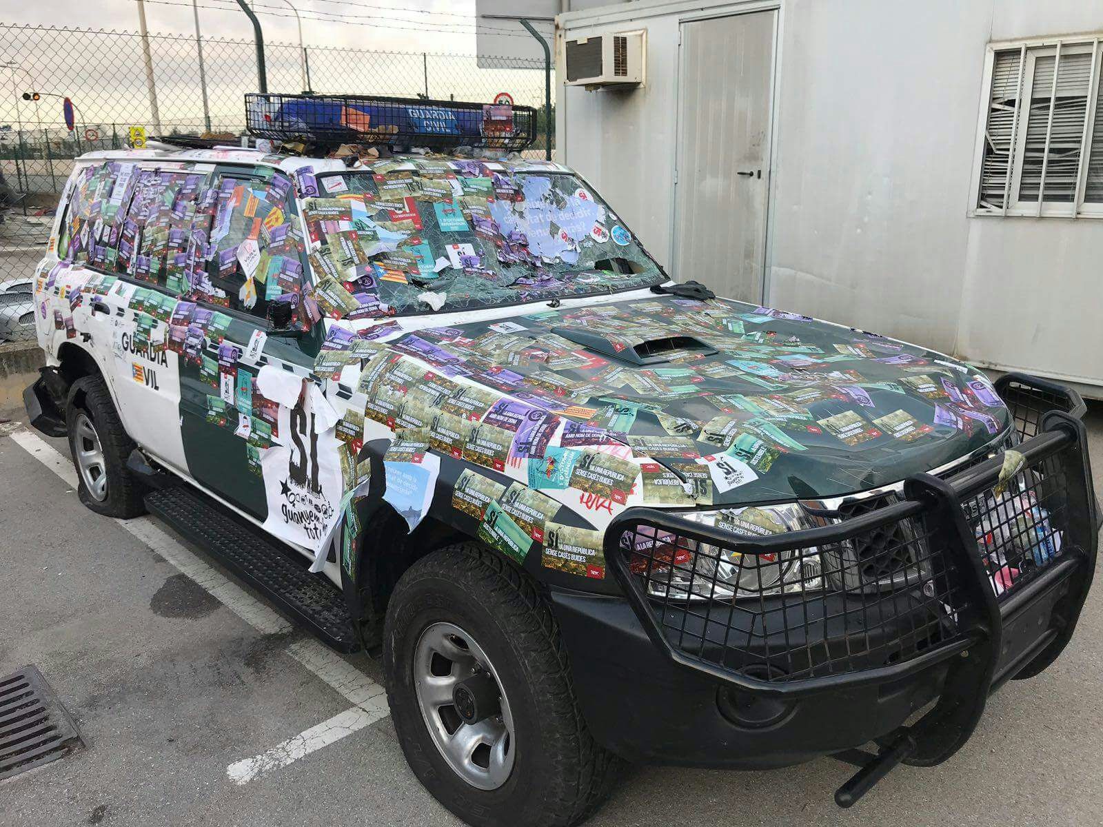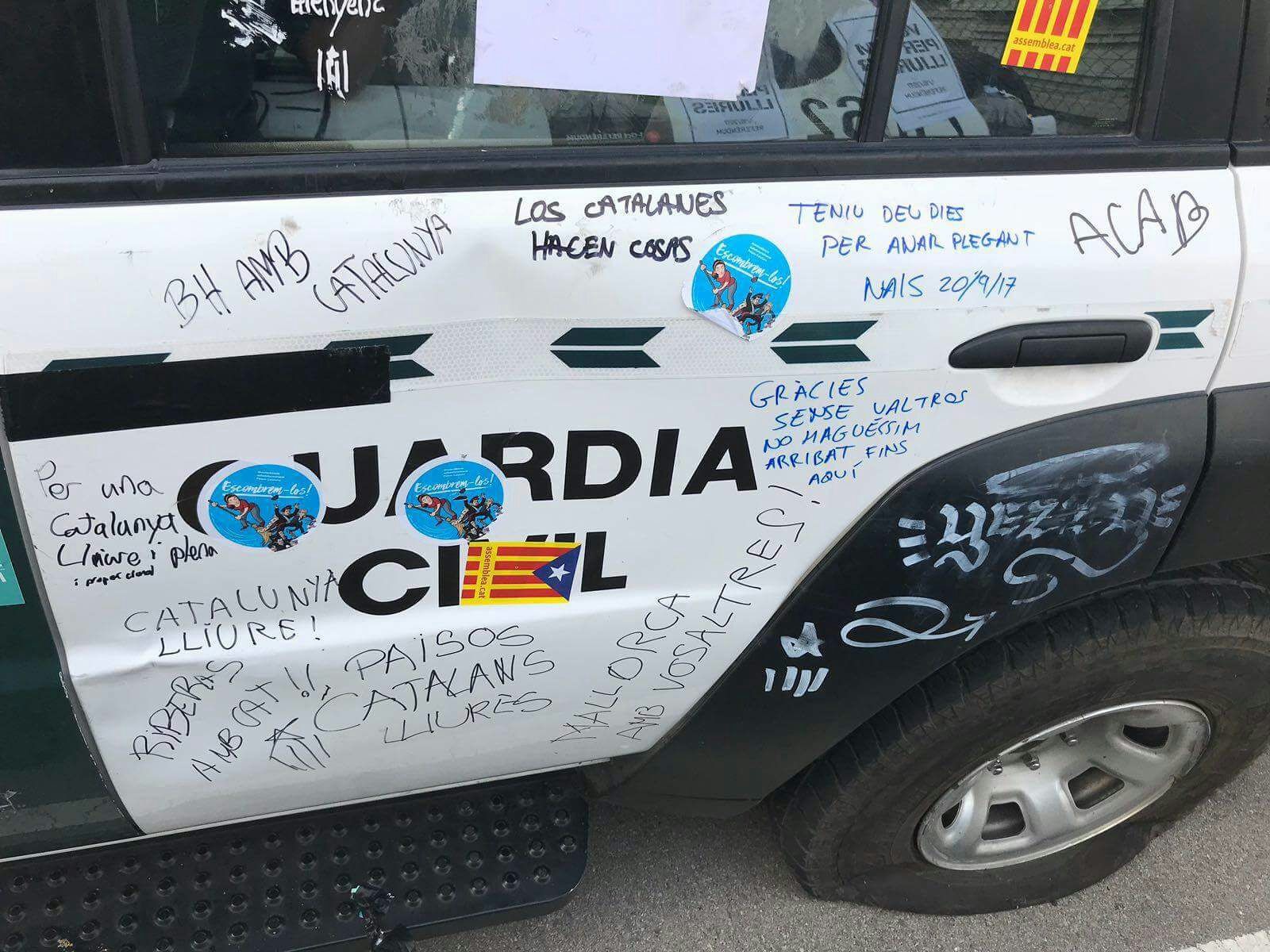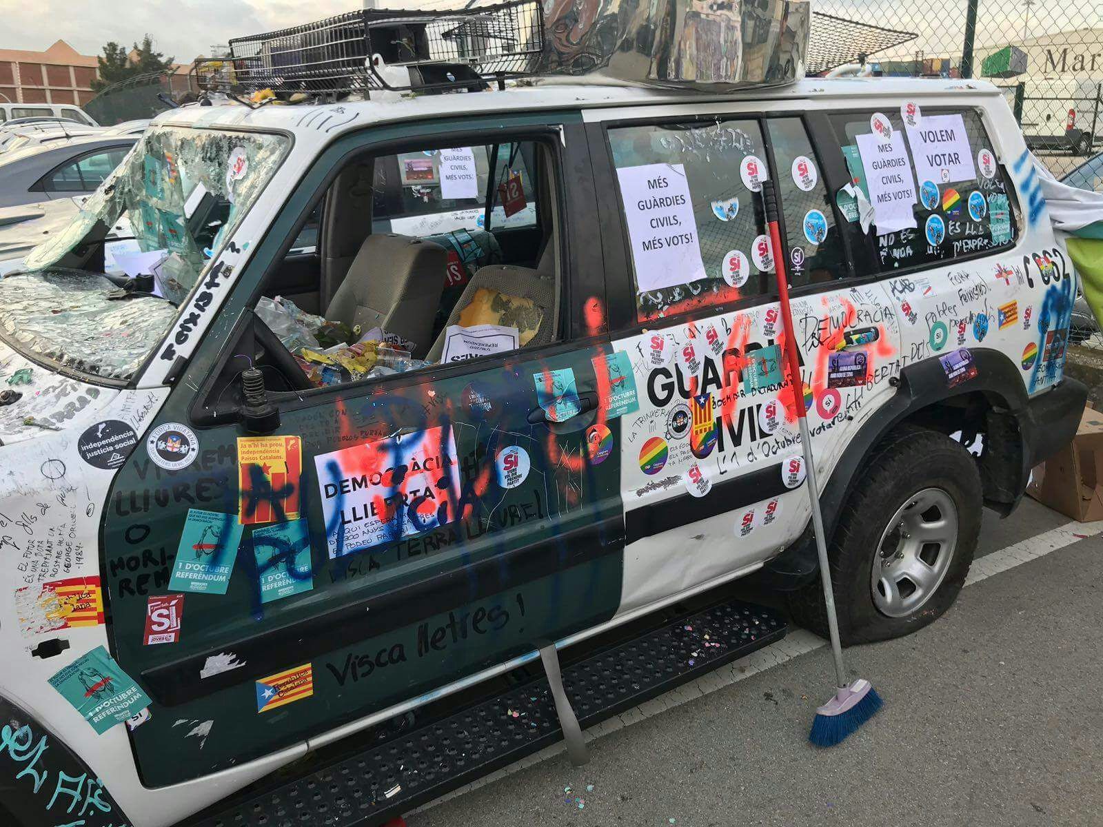 Aspecto de los vehículos patrulla de la Guardia Civil atacados por los independentistas.