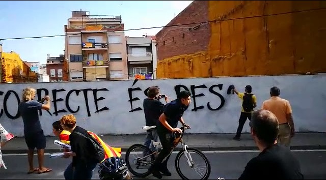 La pasividad de los mossos ante los actos de los independentistas ha quedado reflejado en un vídeo en el que un radical hace una pintada pidiendo desobedecer la ley y éstos pasan como si nada.