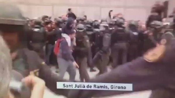 Un agente pidió a un padre que se bajara a su hijo de los hombros en una de las protestas de la mañana, en Sant Juliá de Ramis.
