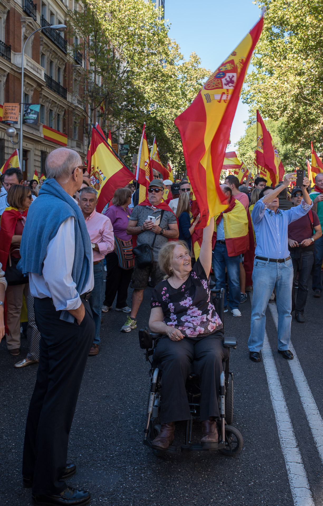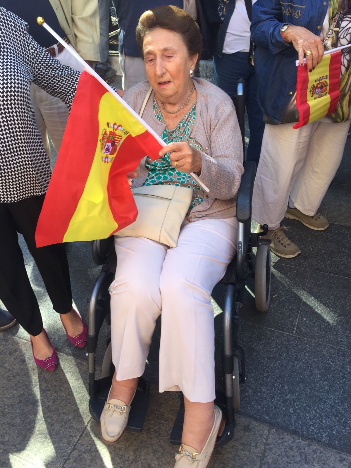 Una mujer que ha acudido con su silla de ruedas y su bandera de España.