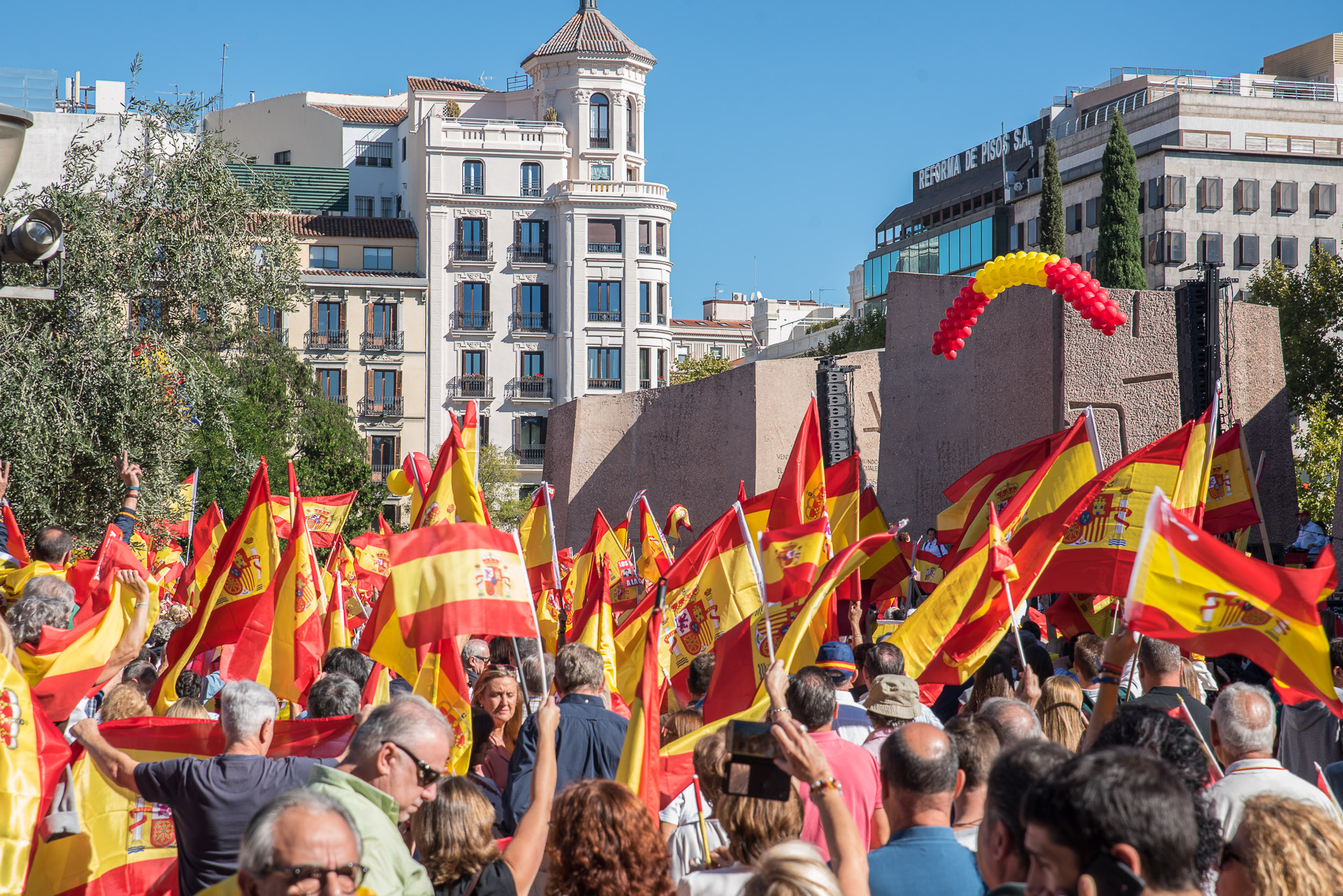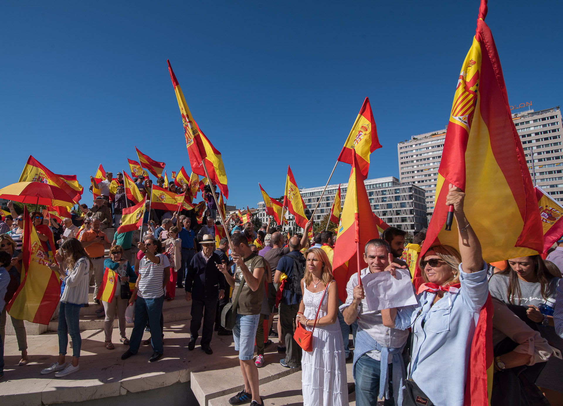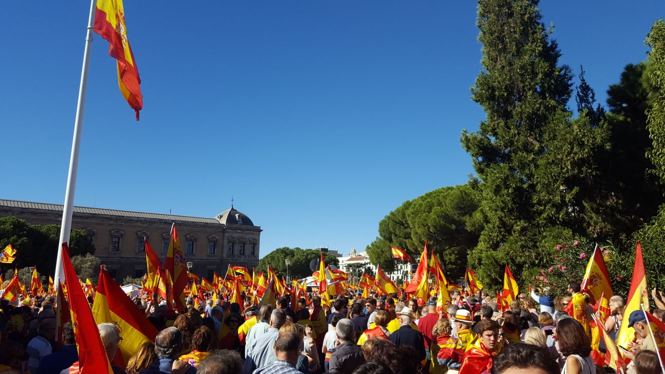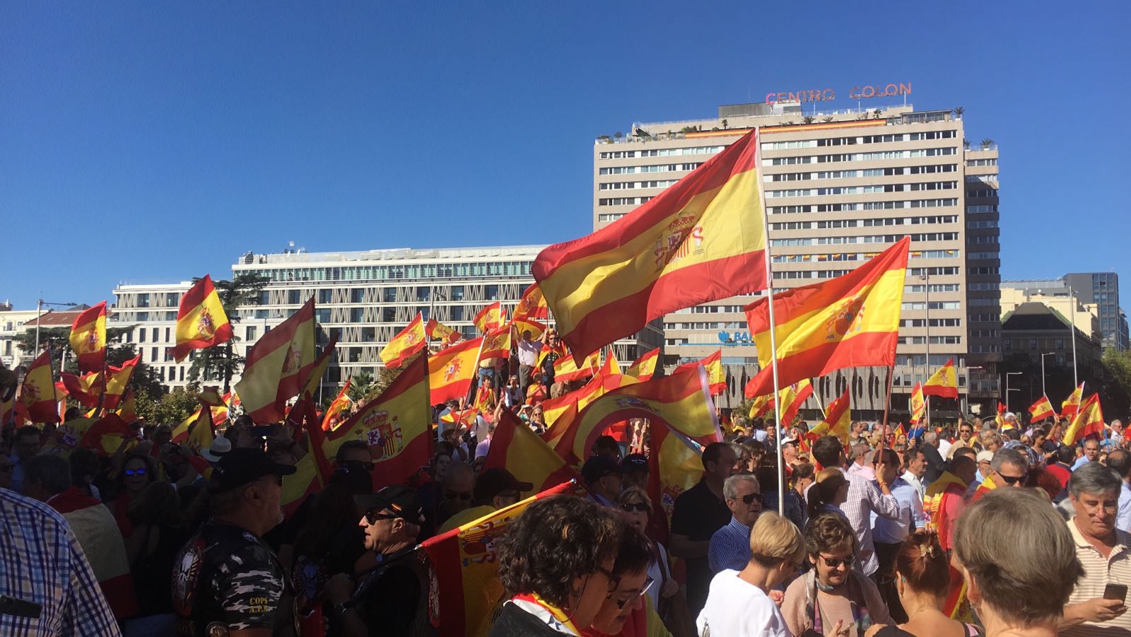 Manifestantes con banderas españolas defienden la unidad de España, la Constitución y el estado de derecho.