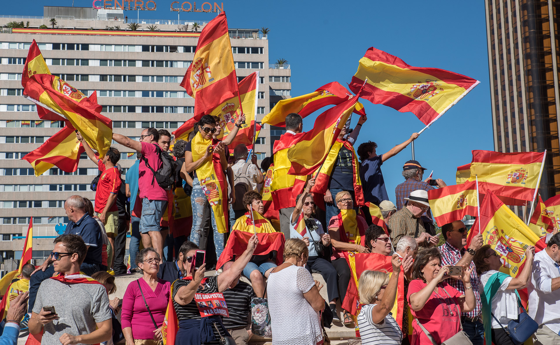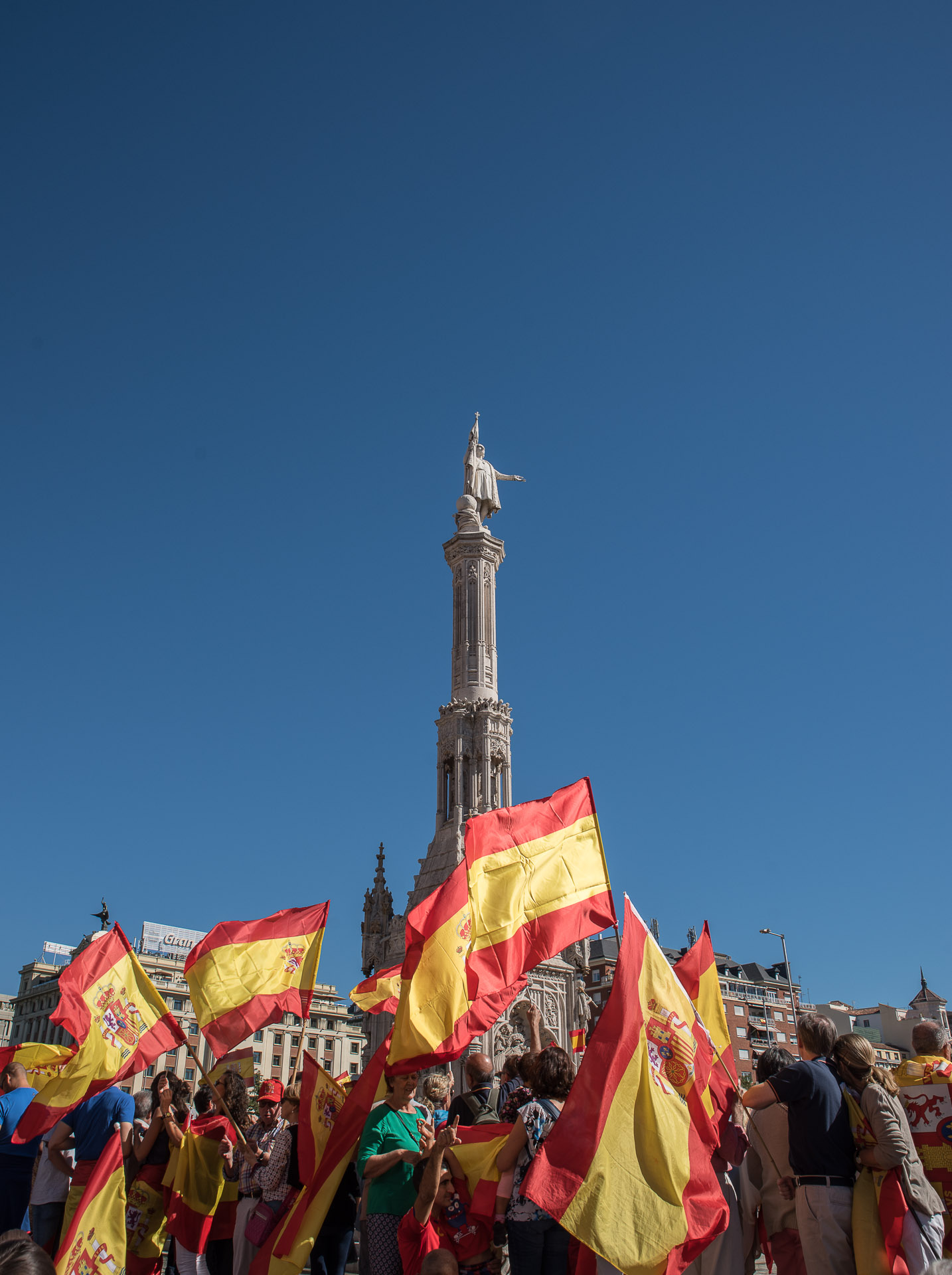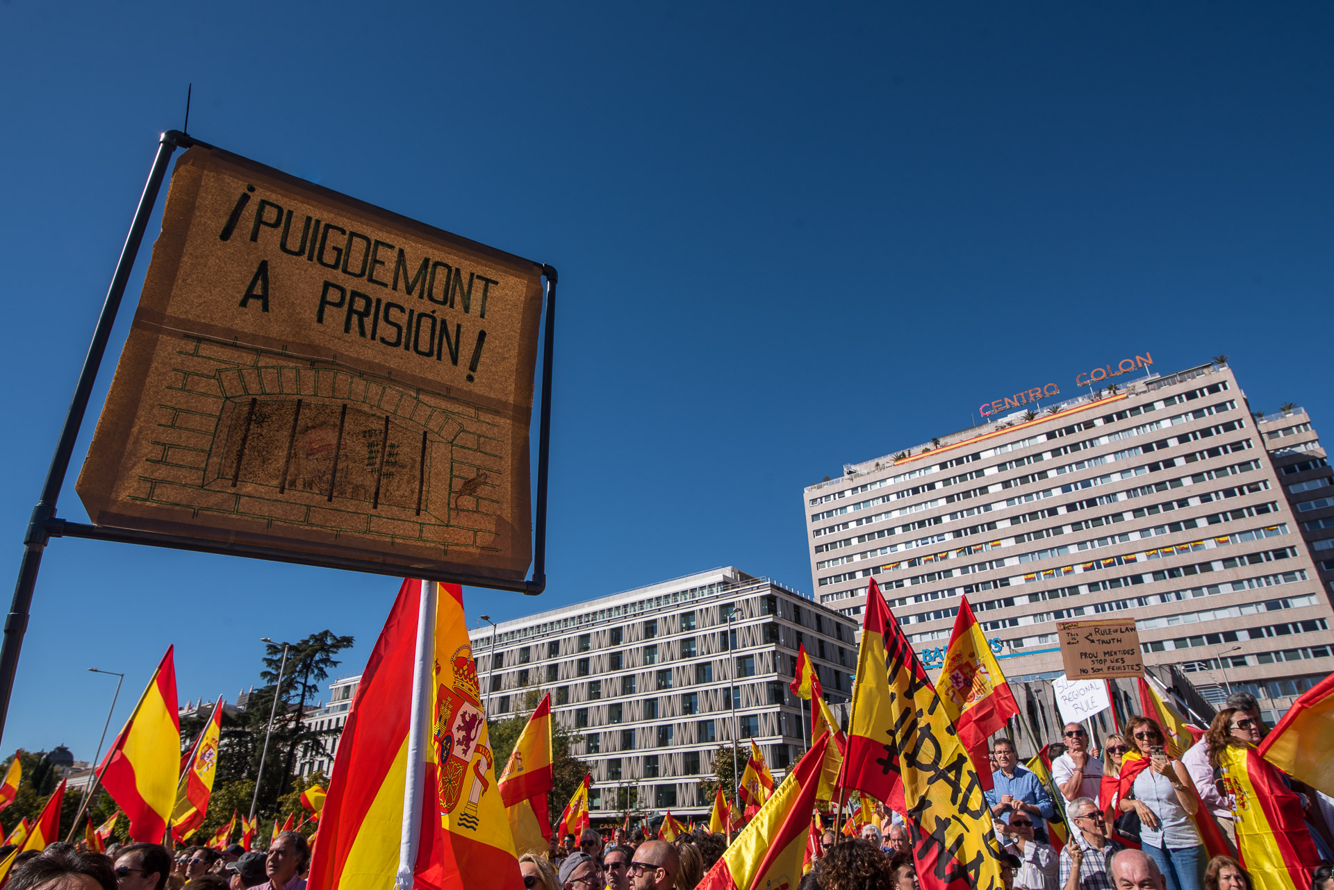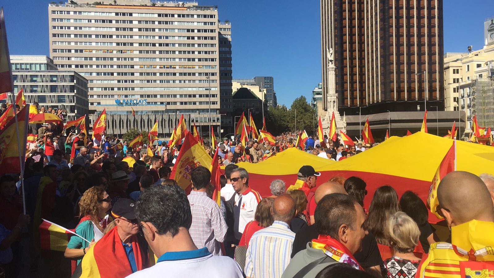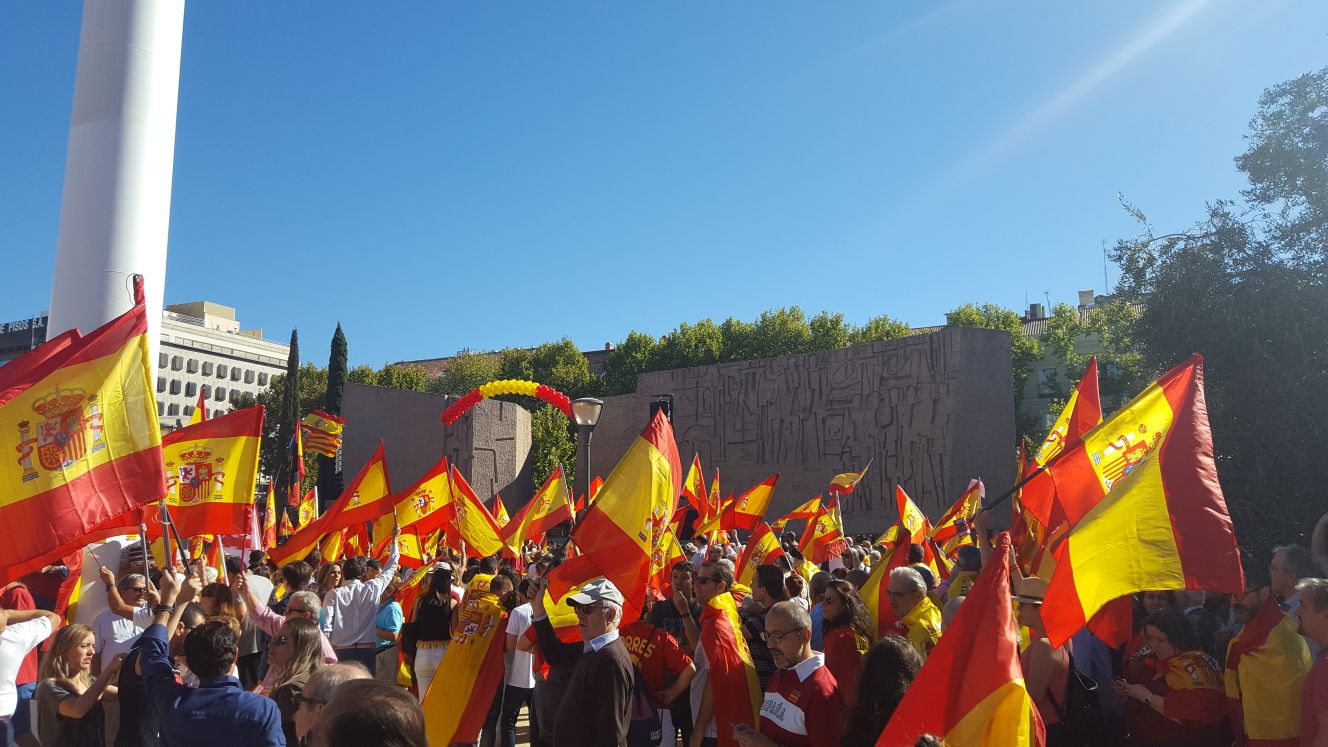 Manifestantes con banderas españolas defienden la unidad de España, la Constitución y el estado de derecho.
