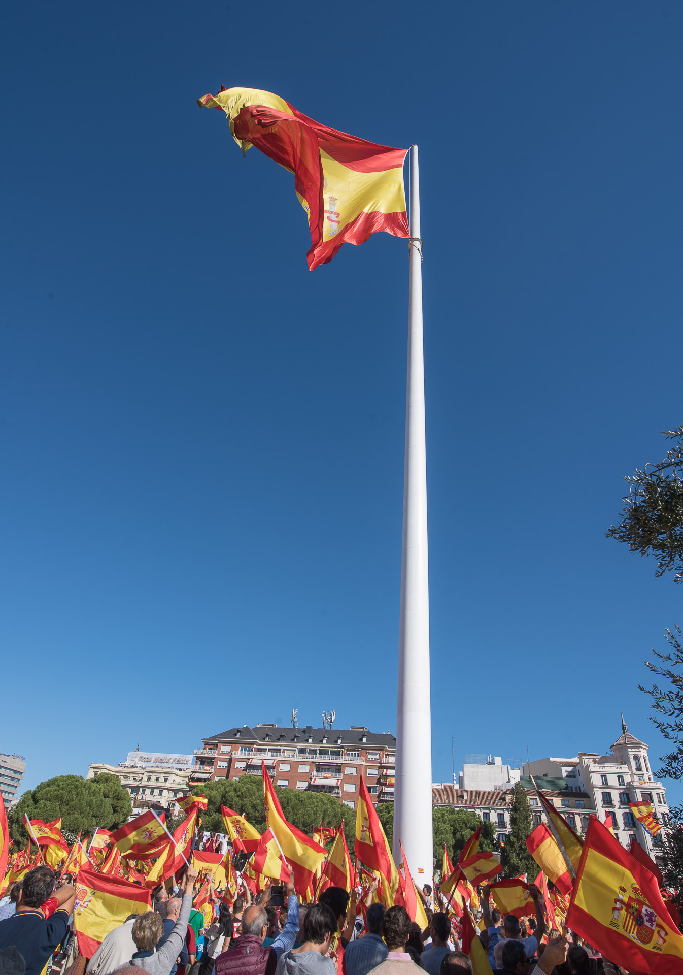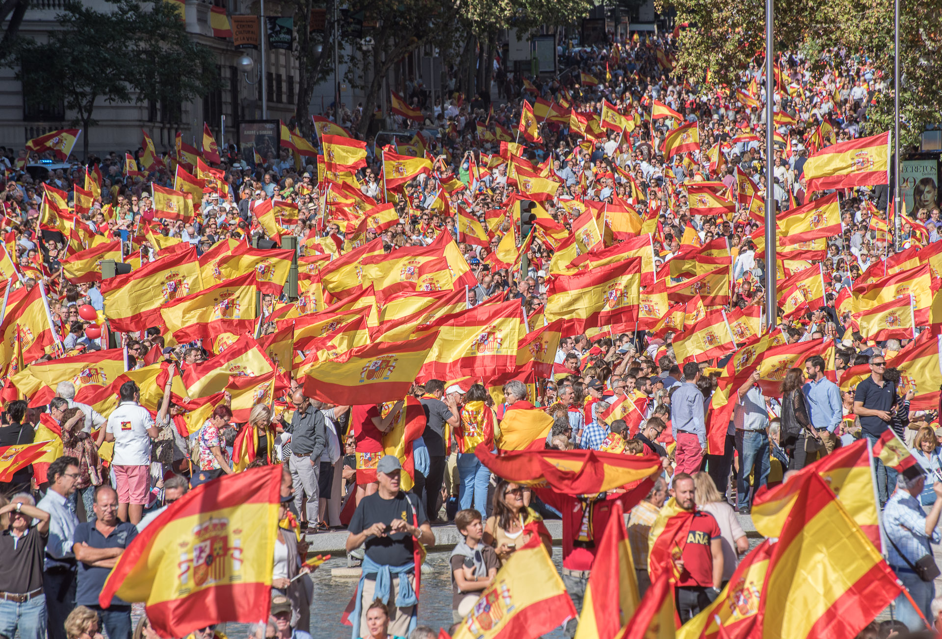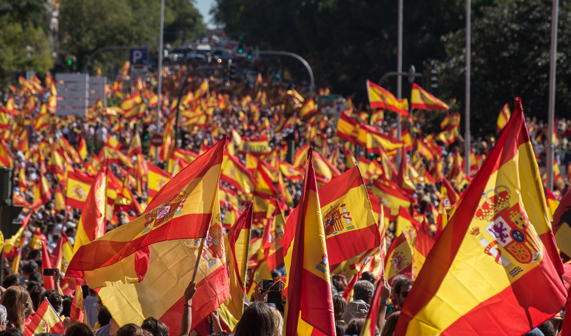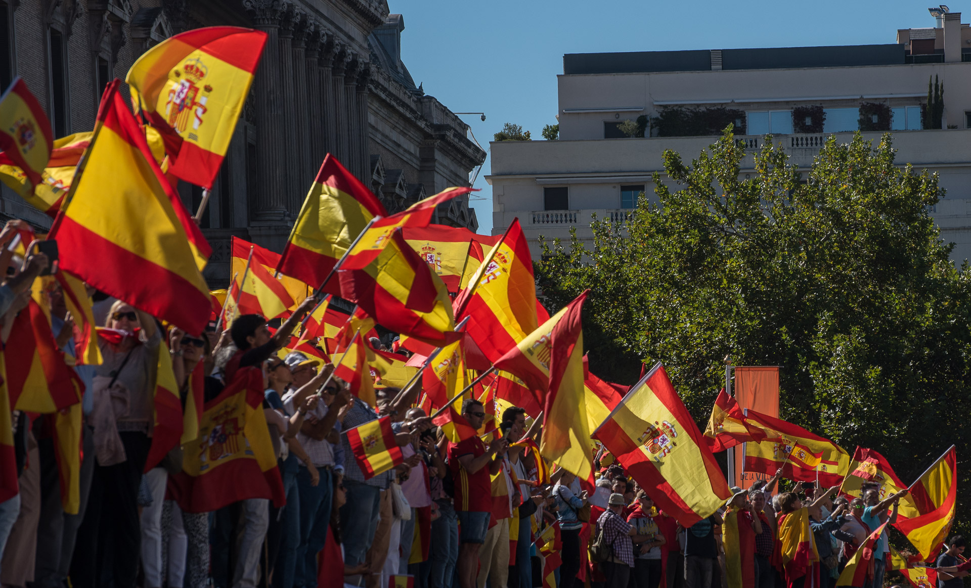 Manifestantes con banderas españolas defienden la unidad de España, la Constitución y el estado de derecho.