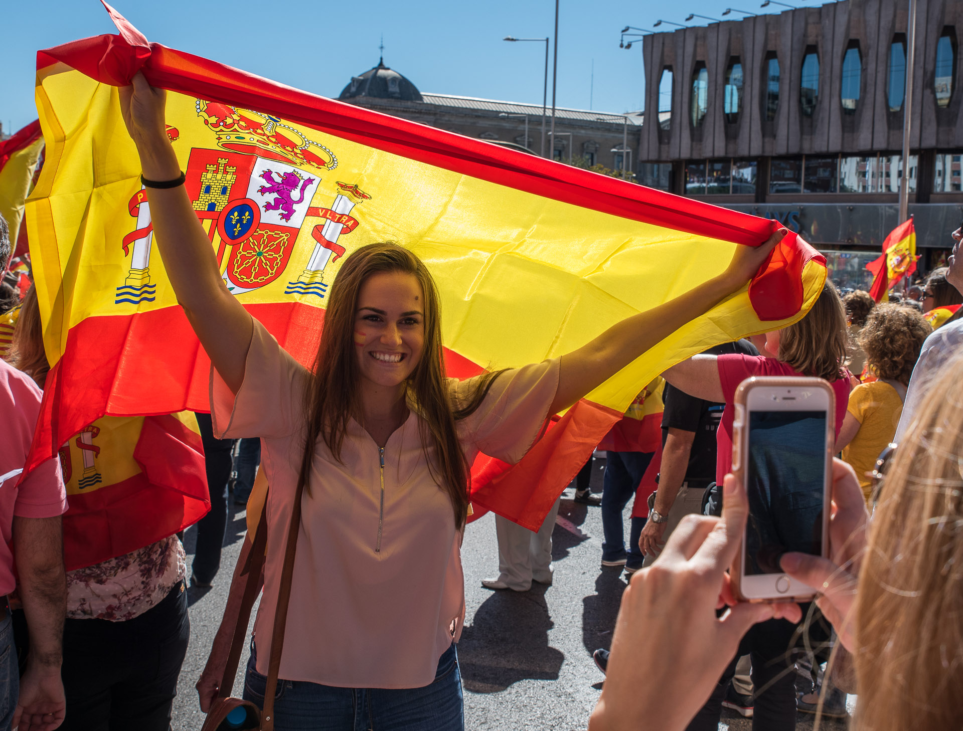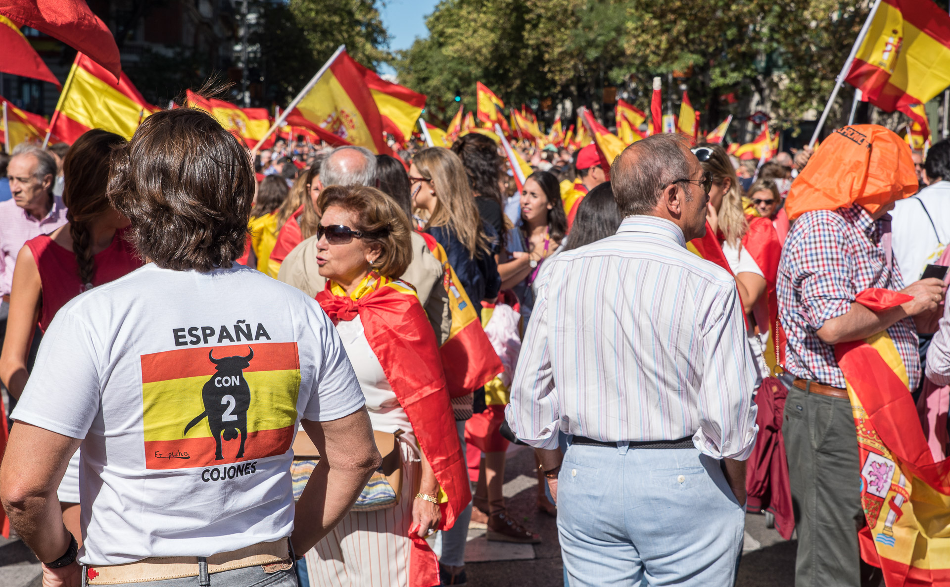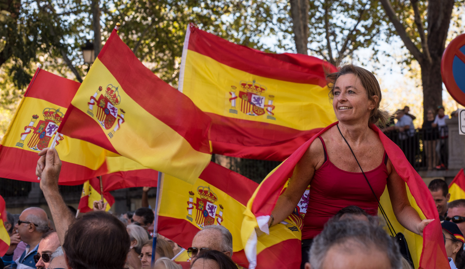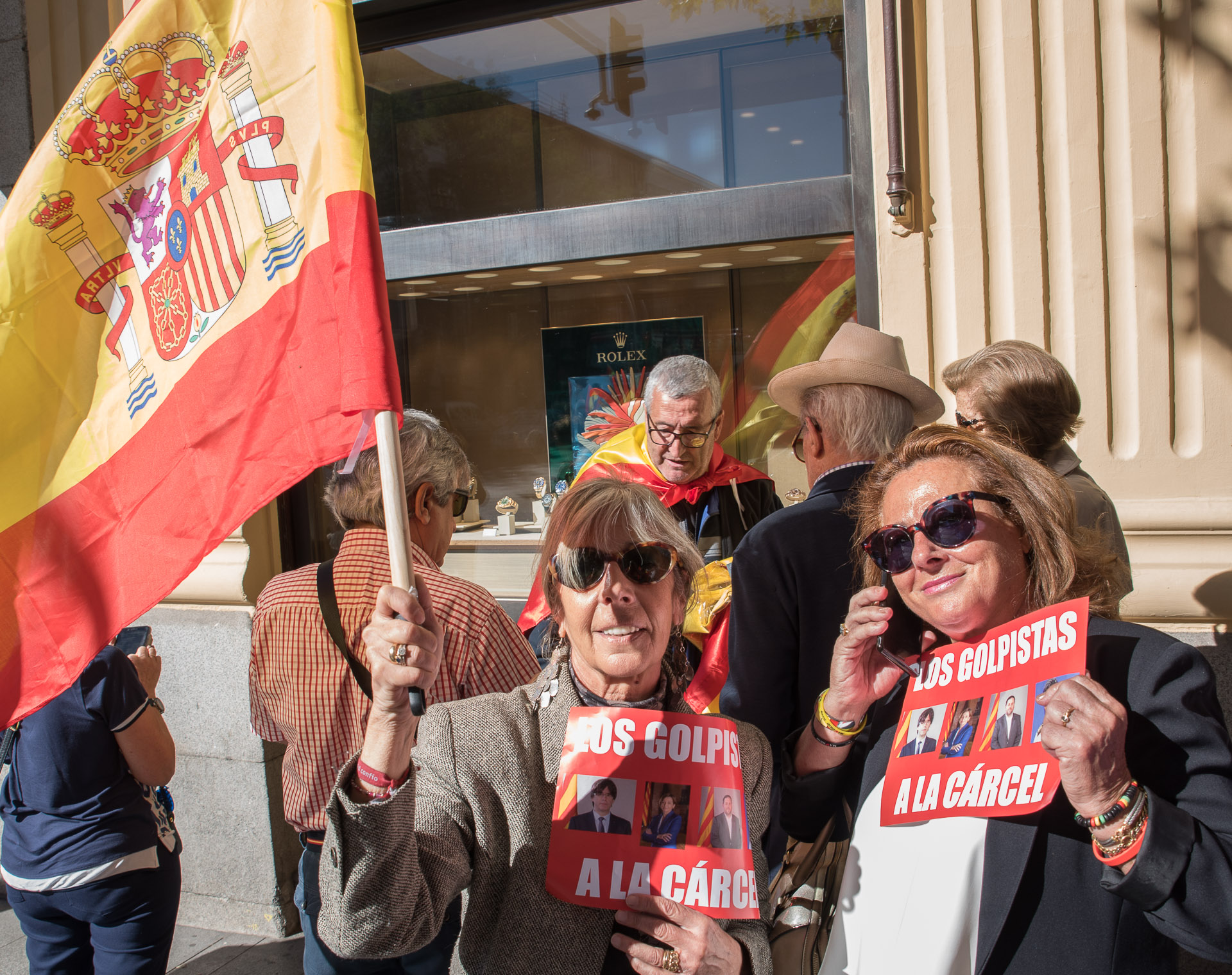 Manifestantes con banderas españolas defienden la unidad de España, la Constitución y el estado de derecho.