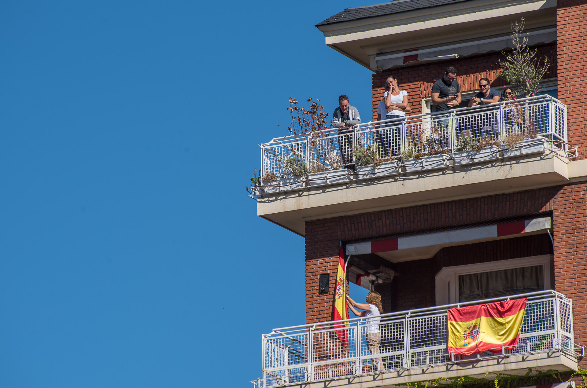 En el suelo de este emblemático espacio público se ha colocado una bandera de España, mientras se escuchaba por los altavoces la canción "Que viva España" de Manolo Escobar.