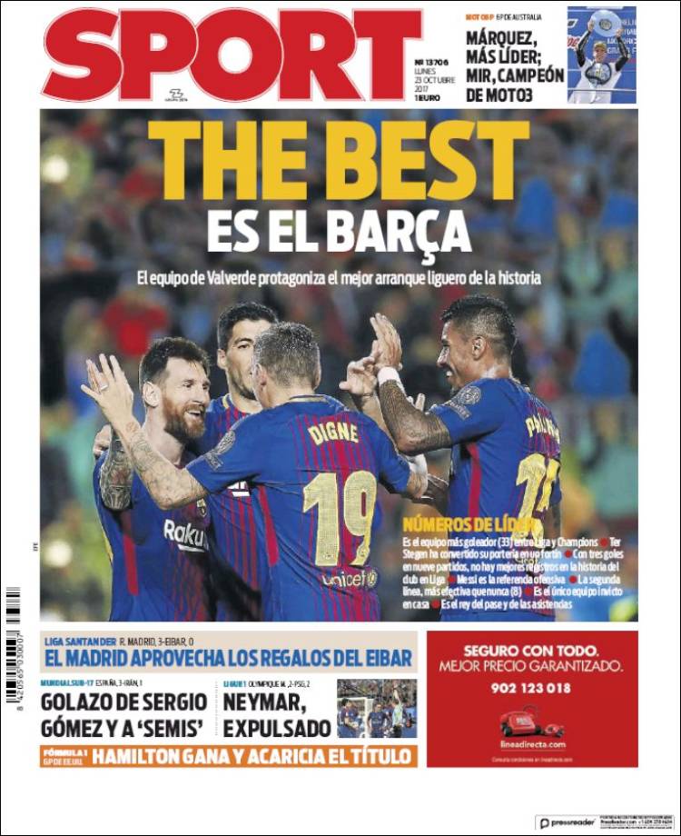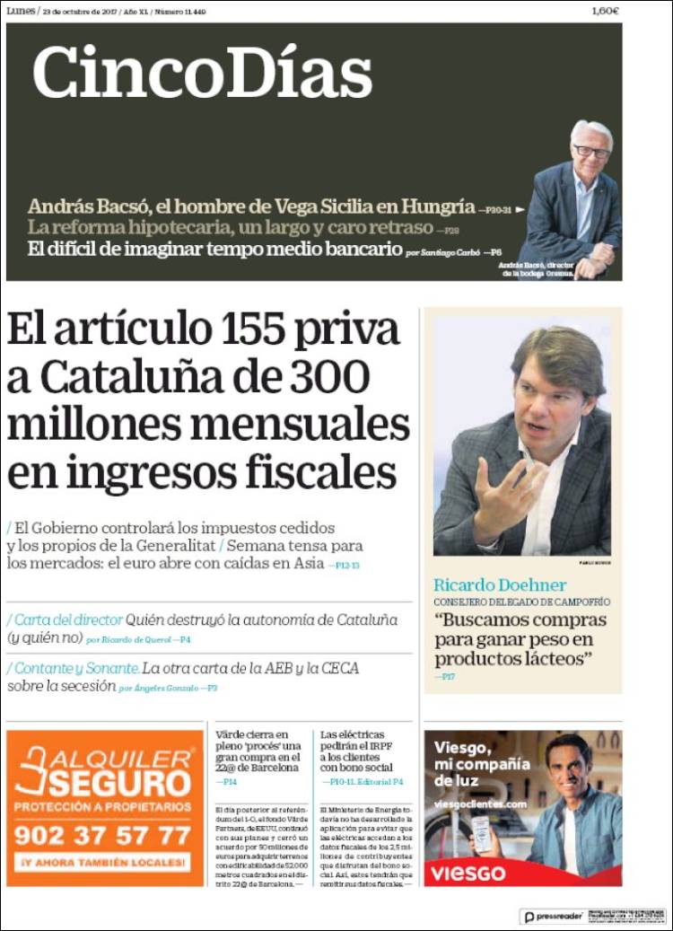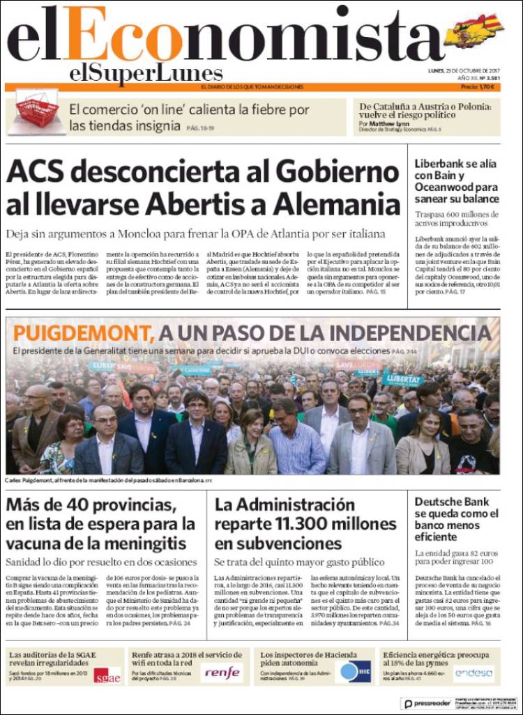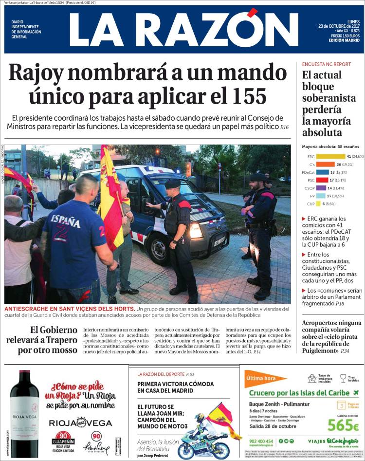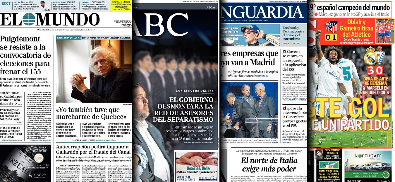 Portadas de los diarios El Mundo, El País, ABC, La Razón, La Vanguardia, El Periódico, Cinco Días, El Economista, Marca, As, Mundo Deportivo y Sport.