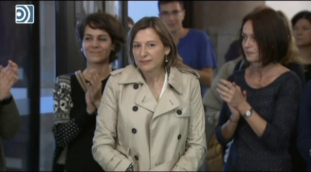 Funcionarios del Parlamento de Cataluña han recibido con aplausos a Carme Forcadell después de que ayer acudiera a la Audiencia Nacional para declarar por delitos de rebelión, sedición y malversación.