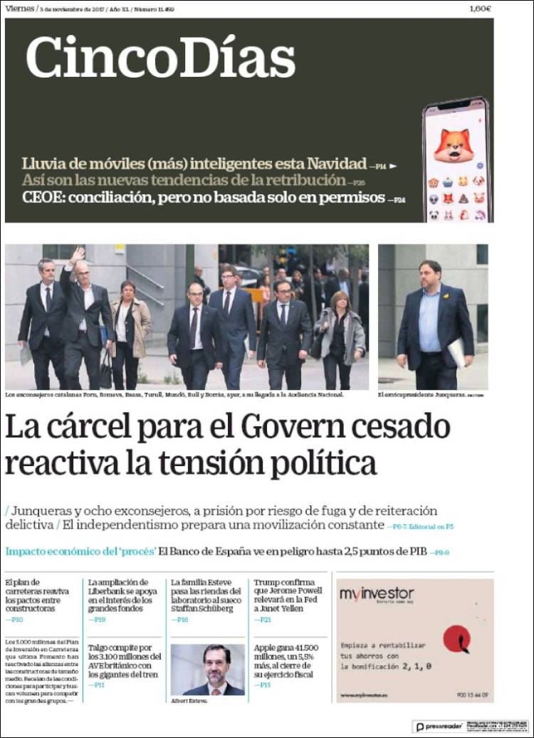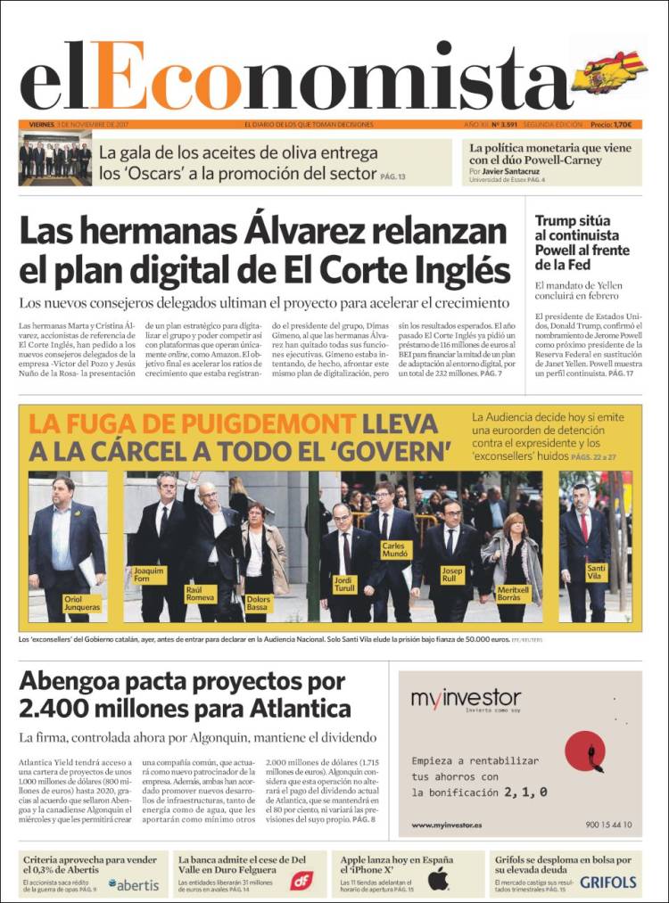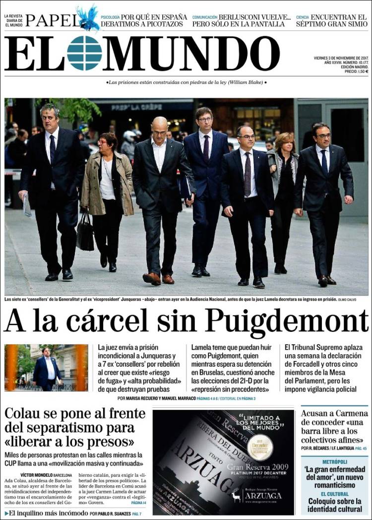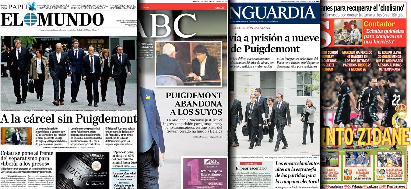 Portadas de los diarios El Mundo, El País, ABC, La Razón, La Vanguardia, El Periódico, Cinco Días, El Economista, Marca, As, Mundo Deportivo y Sport.