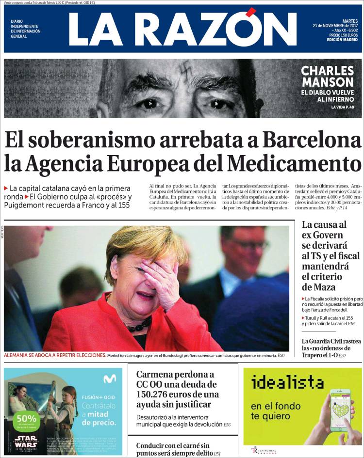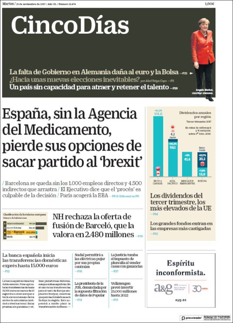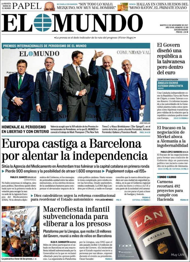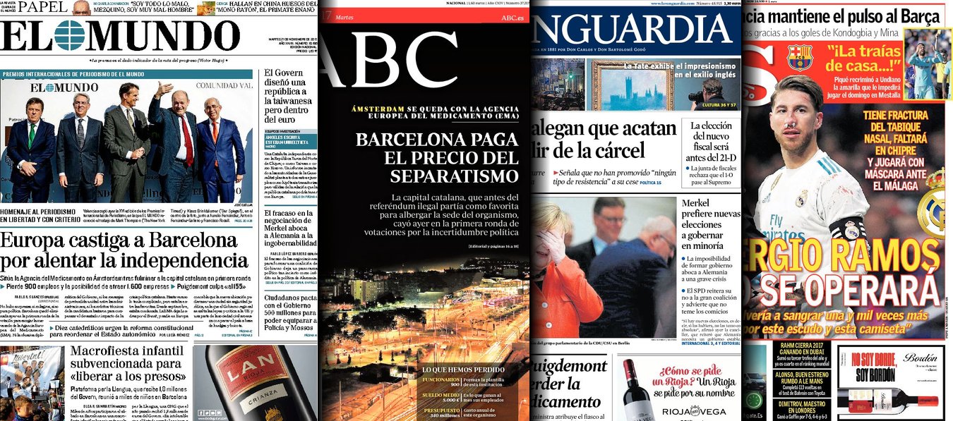 Portadas de los diarios El Mundo, El País, ABC, La Vanguardia, El Periódico, Cinco Días, El Economista, Marca, As, Mundo Deportivo y Sport.