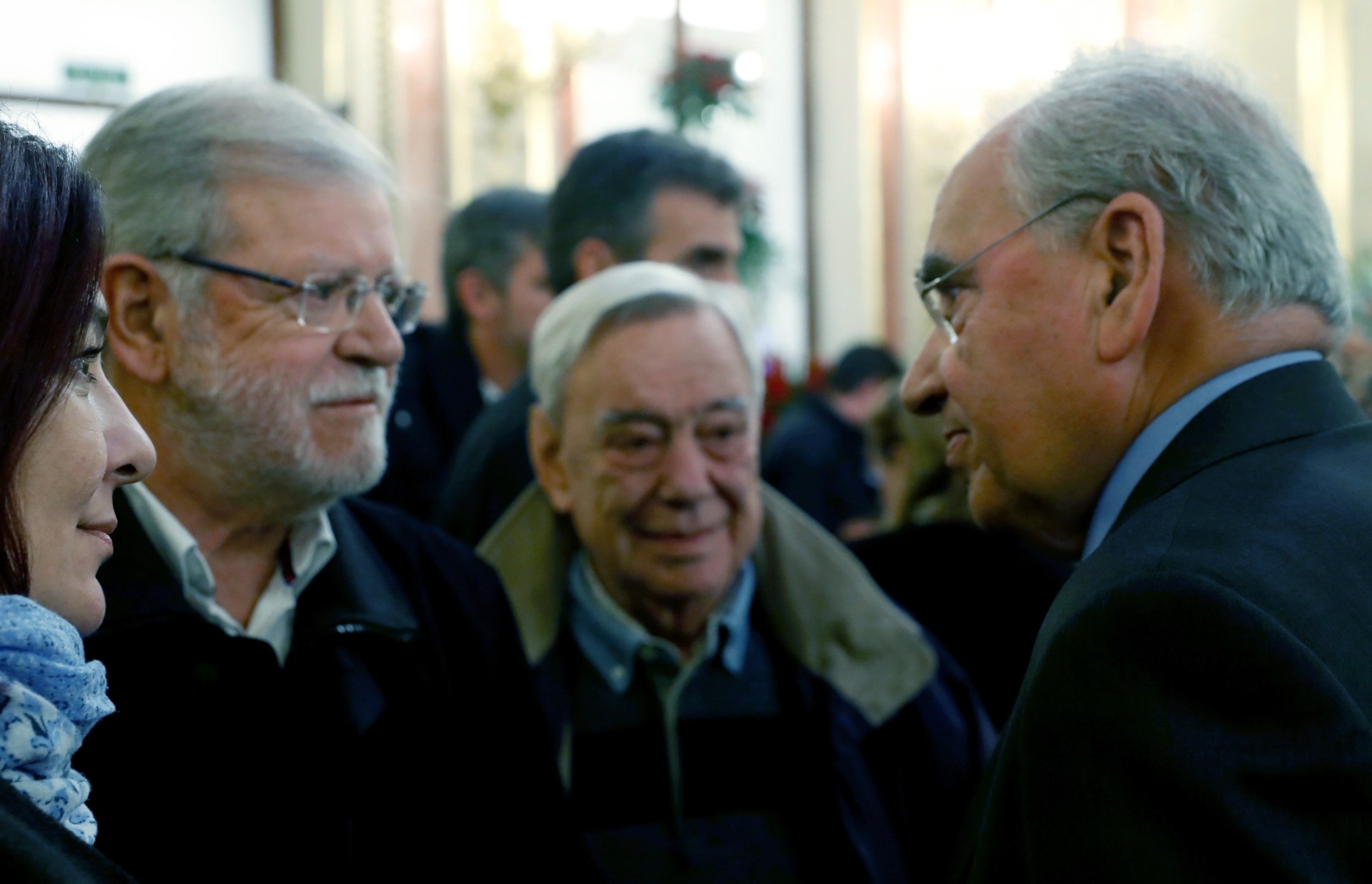 El exvicepresidente del Gobierno Alfonso Guerra conversa con el expresidente de Extremadura, Juan Carlos Rodríguez Ibarra, en la capilla ardiente de Manuel Marín.