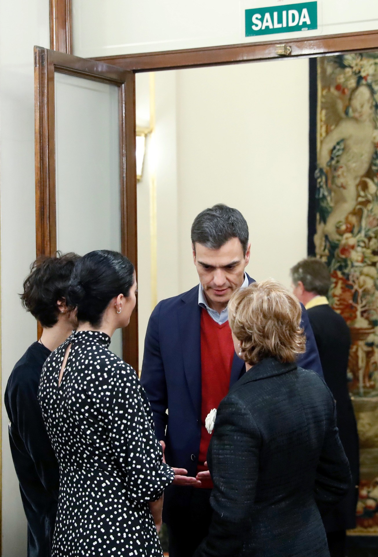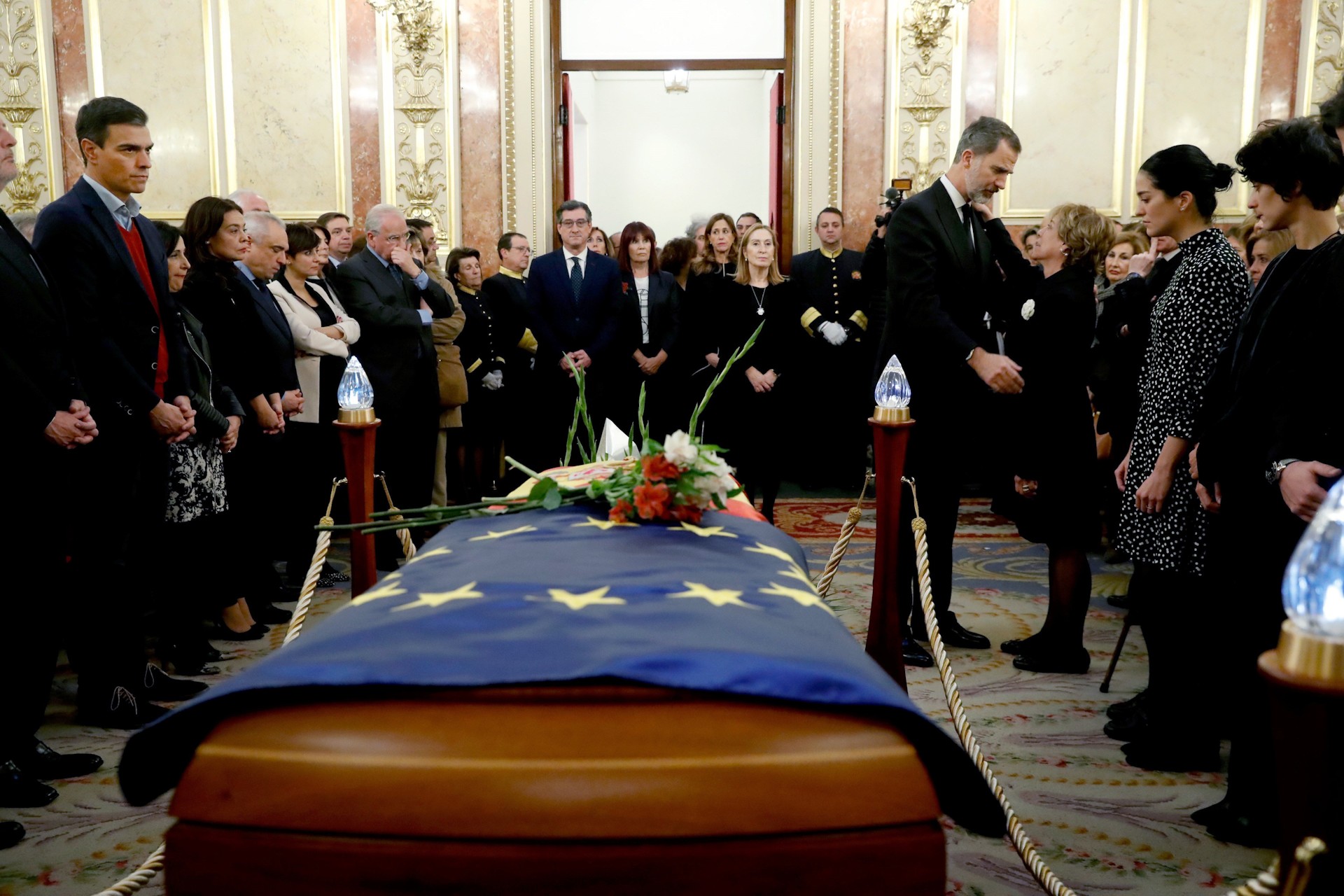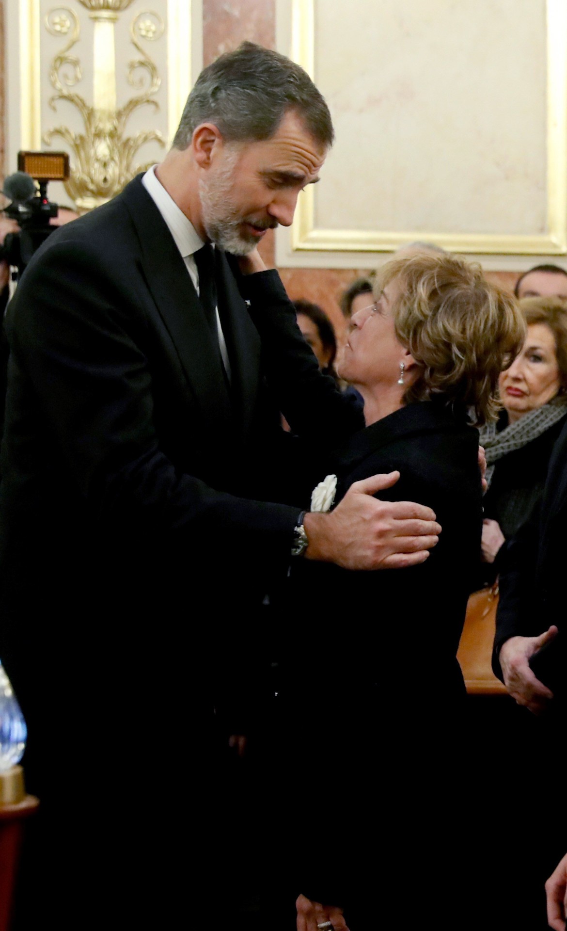 Feilpe VI saluda a la viuda de Manuel Marín, Carmen Ortiz, en la capilla ardiente del expresidente del Congreso.
