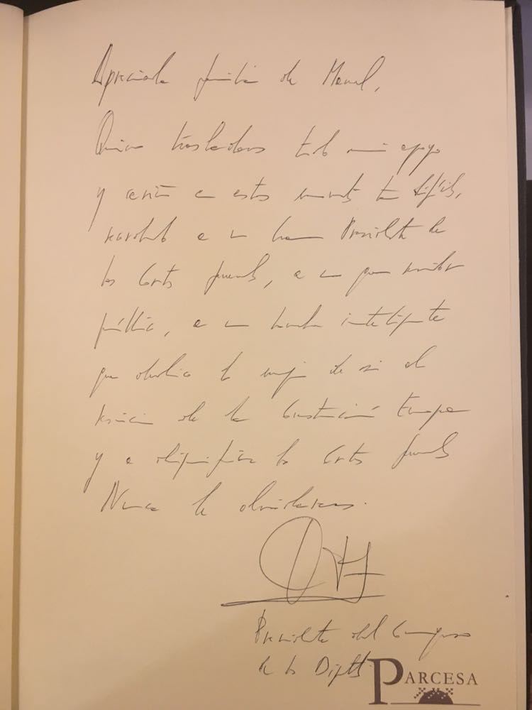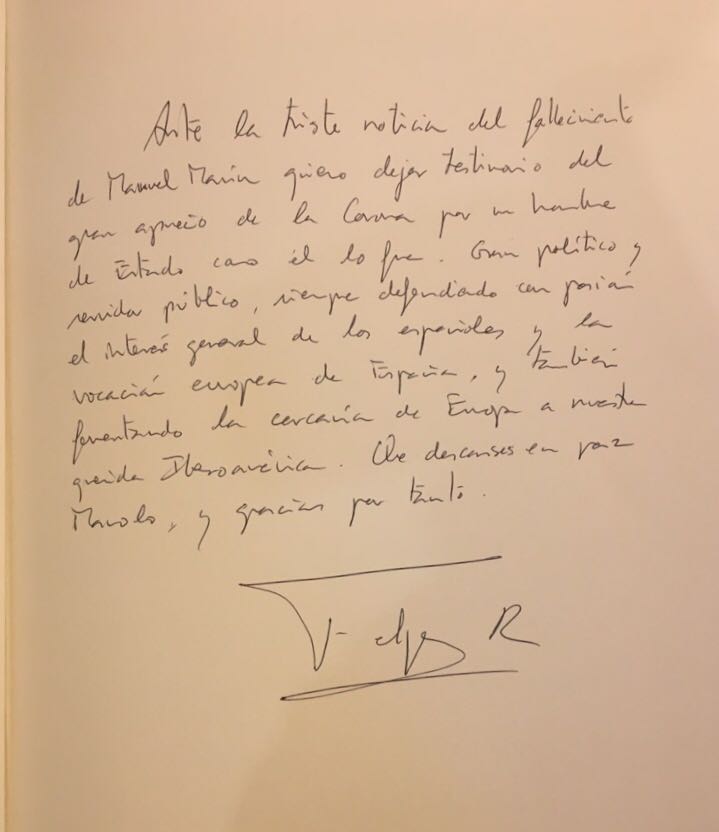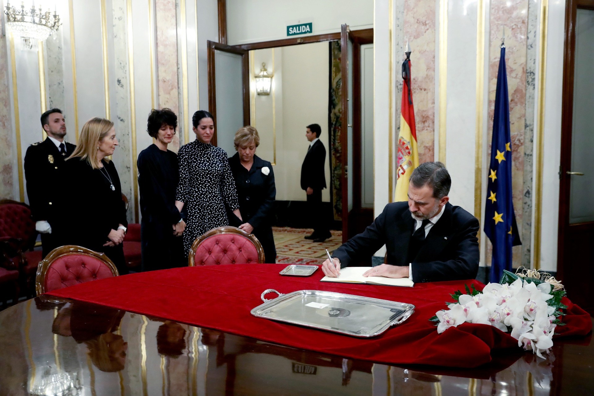 El rey Felipe VI escribe una dedicatoria en la capilla ardiente del expresidente del Congreso, Manuel Marín.