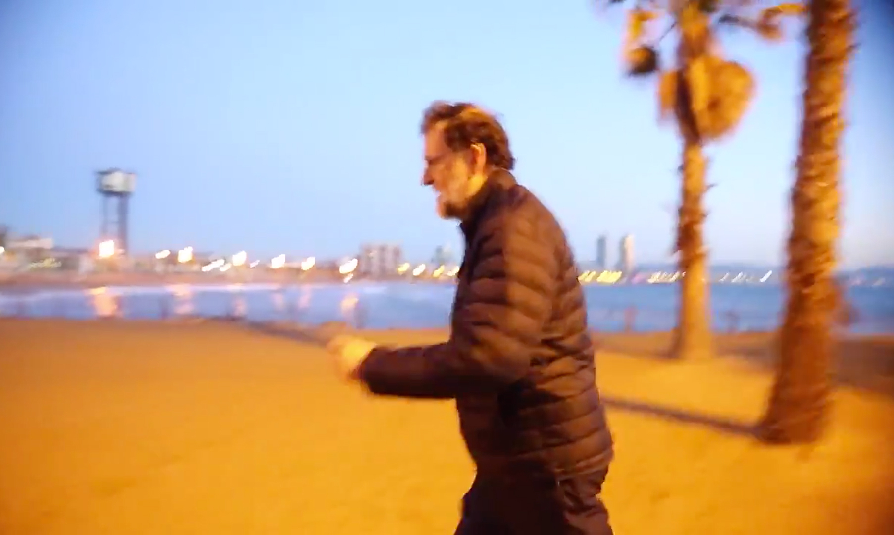 El presidente, vestido con pantalones cortos pero con una voluminosa cazadora, aparece en uno de sus paseos rápidos por la playa de Barcelona y por otros puntos cercanos de la ciudad.